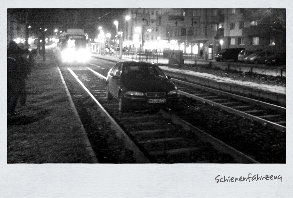 Ein Auto vor der Strassenbahn? Hier hat doch die Bahn eine eigene Trasse? Mit Schotter! Und genau dorthin hat sich das Auto verirrt, wie auch immer. Auf jeden Fall gings nicht weiter.
