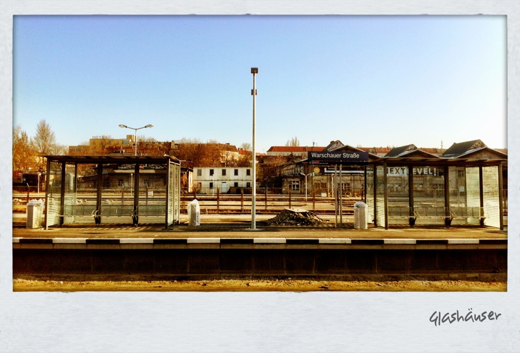 Laut Plan sollte der neue Bahnsteig am Bahnhof Warschauer Strasse schon längst in Betrieb sein, die erste Aprilwoche war im Gespräch. Die östliche Hälfte ist auch bereits asphaltiert und zwei Wartehäuschen in schmucken Glas zieren den Bahnsteig. Eine gewagte Wahl der Mittel im ruppigen Kiez. Mal sehen wie lange das gut geht.