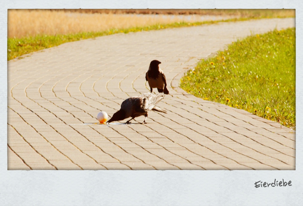 Eigentlich wollte ich nach Graugänsen Ausschau halten, die wir bei der Einfahrt nach Zingst zu hunderten auf den Wiesen gesehen hatten, aber um unseren Campingplatz herum, stehen am frühen Abend nur ein paar vereinzelte Paare. Dafür liegt mitten auf dem Deich ein großes weißes Ei aus dem gelbes Eidotter läuft. Ansonsten sieht es recht unbeschädigt aus. Wie kommt das Ei hierher? Sieht nicht so aus, als wäre dies ein geeigneter Ort zum Brüten. Ich fahre mit dem Rad ein Stück vorbei, halte an und nehme die Kamera in Position. Irgend jemanden muss es ja gehören, auch wenn es kaputt ist. Ich muss auch nicht lange warten bis die Räuber vorsichtig erscheinen. Noch stehen sie in einiger Entfernung und peilen die Lage, aber der Hunger treibt sie heran. Mit dem Schnabel wird das Eigelb nun schnell aufgeschlürft. Eile ist geboten, kommen doch dauernd Radfahrer vorbei und stören das Abendessen mitten auf dem Weg. Irgendwann bekomme ich auch Hunger und mache mich auf dem Weg zurück. Irgendeine Gans oder Möwe wird nun keinen Nachwuchs mehr bekommen, er ist den Eierdieben zum Opfer gefallen.