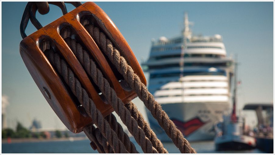 Also noch mehr Entschleunigung. Ich überlege schon zum Strand zu schwimmen, geht bestimmt schneller. Aber wir sitzen alle in einem Boot und warten auf die Entscheidung der Crew. Auf See würde man jetzt einfach ausharren, bis der Wind wieder auffrischt und das Boot vorantreibt. Eine harte Geduldsprobe für hibbelige Stadtbewohner wie mich. Aber zum Glück ist es ja ein Motorsegler und ein Teil der Crew muss den Zug um kurz nach halb sieben vom Bahnhof Warnemünde erwischen. So werden die Segel gerefft und der Diesel wieder angeworfen. Mit Wind in den Haaren geht es nun volle Kraft zurück in die Warnow und mit einer spitzen Wende machen wir pünktlich wieder an der Mole fest. Gerade rechtzeitig um die AIDAmar zu verabschieden, das komplette Gegenmodell zum gemächlichen Segelschiff. Die Tour der AIDA würde mit der Maltzahn sicherlich 8 Wochen statt 8 Tage dauern.