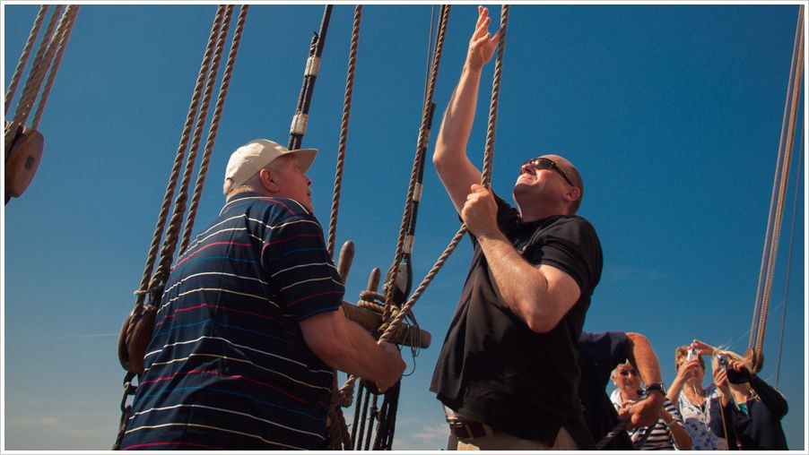 Die Tour beginnt um 15 Uhr und mit mir kommen noch 20 mehr oder weniger segelerfahrene Leute an Bord. Nach kurzer Einführung durch den netten Käptn, machen wir die Leinen los und schippern mit Hilfe des Diesels aus dem Warnowkanal in die Ostsee. Kurze Zeit später wird der Motor ausgeschaltet und – unter fachmännischer Anleitung der Crew mit Hilfe einiger Passagiere – werden die Segel gehisst. Das Schiff ist eine Gaffelketsch mit einer Segelfläche von rund 320 qm, die sich jetzt im Wind blähen und das Schiff langsam in die Ostsee fahren lassen. Und hier beginnt die Entschleunigung, auch für mich ganz persönlich.