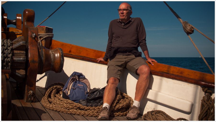 Also erste Erkenntnis: Segeln, noch dazu auf alten Fischkuttern, hat nichts mit einer Regatta zu tun, wo die Segler hart am Wind um Sekundenbruchteile kämpfen. Das Ziel ist rauszufahren, die Fischernetze auszuwerfen, zu warten bis genug Fisch drin ist und mit der Ladung wieder zurück in den Hafen zu kommen. Das möglichst ohne zu kentern. Nur mit den Segeln ist es herrlich still an Bord des hölzernen Klippers, nur die Segel knattern hin und wieder und aus der Kombüse dringt frischer Kaffeeduft hinauf an Deck. Das Signal für die Passagiere sich unter Deck zu begeben. Hier riecht es neben Kaffee noch nach Diesel und ohne Blick auf den Horizont ist sind die Schiffsbewegungen auch eher unangenehm. Mit einem Kaffee und einem frischen Stück Apfelkuchen von Kristina, mach ich es mir im Bug des Schiffes bequem.