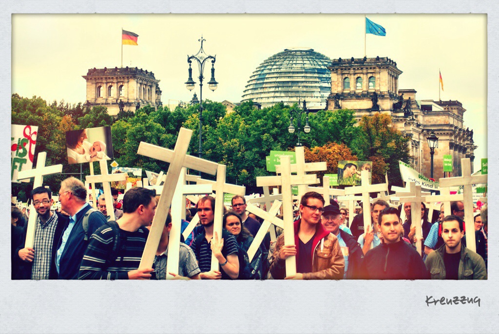 Eine Polizeikolonne aus Richtung Brandenburger Tor kündigt dann auch bereits die nächste Demonstration an. Ein Unmenge Kreuze und Parolen tragender Menschen, dabei erstaunlich viele Männer, die auf dem „Marsch für das Leben“ gegen Abtreibung, dafür Kindergeld für Ungeborene, gegen Mißbrauch, und noch vieles andere demonstrieren. Dreitausend Menschen sind dazu aus dem gesamten Bundesgebiet am Tag vor der Wahl nach Berlin gekommen. Auch wenn ich vieles nicht teilen kann, das Schöne an einer Demokratie ist aber, das so etwas überhaupt möglich ist. Für seine Ziele auf die Straße gehen zu können, ohne Repressalien befürchten zu müssen. Und natürlich muss man auch die Gegendemonstranten aushalten, die ihre gegenteilige Meinung lautstark kundtun.