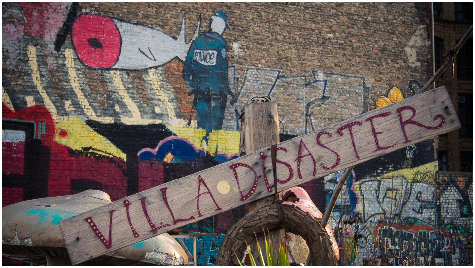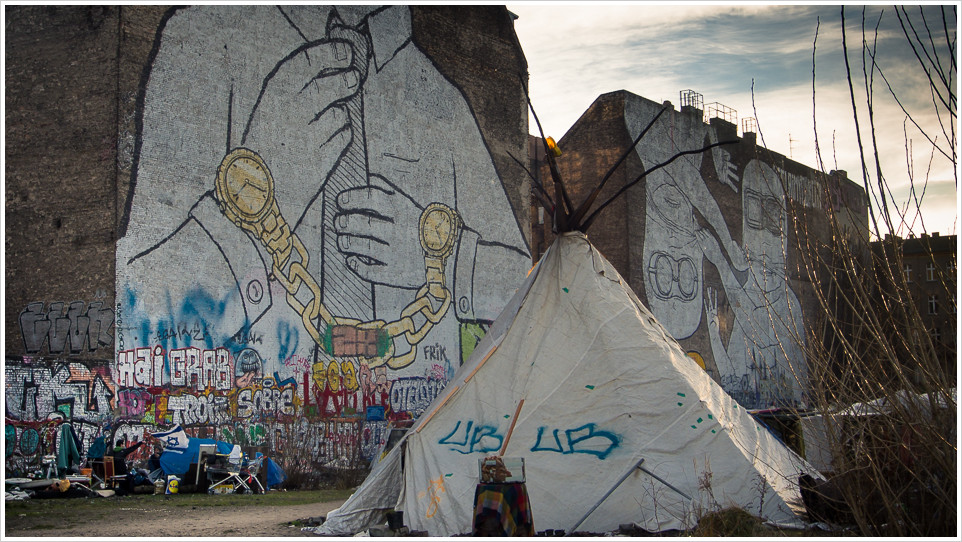 Weniger politisch geht es im zweiten Hüttendorf zu, erstaunlicherweise liegt auch dieses in Kreuzberg. Vielleicht ist das aber auch gar kein Zufall und Kreuzberg bietet dieser Art von Selbstverwirklichung einfach genügend Raum. Ist der Oranienplatz allerdings öffentliches Gelände, ist die Cuvrybrache in Privatbesitz und eigentlich sollen dort auch schon längst die „Cuvry-Höfe“ gebaut werden. Der Investor hat schon weitgehendes Entgegenkommen signalisiert, wurde aber auf der letzten Bürgerversammlung niedergebrüllt. Man gibt seine Freiräume nicht so einfach auf.