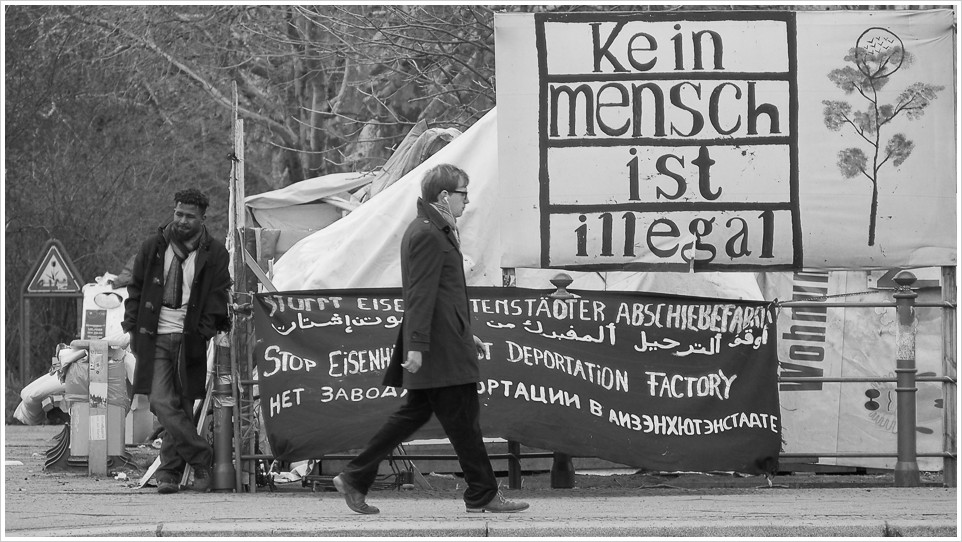 Eigentlich soll der Platz ja geräumt werden, nur traut sich politisch – noch dazu kurz vor dem 1. Mai – das keiner zu. Der Bezirk schiebt die Zuständigkeit auf den Senat und der schiebt sie wieder zurück ins Bezirksamt. Solange bleibt alles so wie es ist. Politisch gesehen geht es den „Bewohnern“ um die Abschaffung der Residenzpflicht, das Verbot von Abschiebungen, Abschaffung der Flüchtlingsheime, Recht auf freie Wahl des Wohnortes, Recht auf Arbeit und das Recht auf Bildung. Alles Forderungen die auf der bundespolitischen Ebene entschieden werden müssten. Sozusagen ein gordischer Knoten.