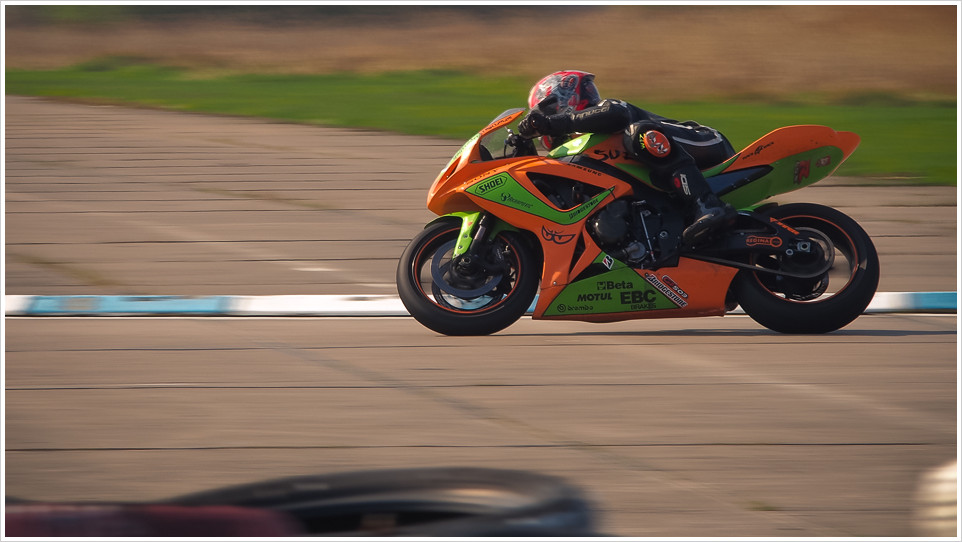 Wichtig ist dabei den Stabilisator an der Kamera auszuschalten. Er ist der natürliche Feind von Bewegungen mit der Kamera. Genau das versucht er ja auszugleichen, was eher zu unschönen Ergebnissen führt. Auch so wird nicht jedes Bild perfekt, aber die Masse machts. Einstellungen: C-AF, IS aus und Serienbild an. Kamera ruhig halten, Motorrad ins Visier nehmen und gleichmäßig mitziehen. Dabei den Finger einfach auf dem Auslöser lassen. So sollten genug Bilder herauskommen auf denen das Motorrad mit Fahrer scharf und der Hintergrund schön verwischt ist. Perfekte Dynamik für diese Sportart.