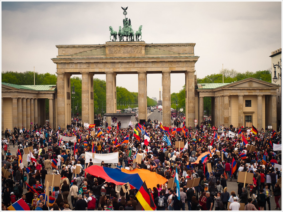 Am Brandenburger Tor ist er aber nicht ganz tot, er taucht dort zumindest in Zitaten auf Plakaten auf. Der Teil der Kurden und Armenier die in Berlin leben, haben ebenfalls zur Demo aufgerufen, für die Anerkennung des Genozids. Das was die Demonstranten ein paar hundert weiter die Straße hinunter verhindern wollen. Die Polizei sorgt dafür, dass sich beide Seiten nicht ins Gehege kommen. Die einen dürfen nicht durchs Brandenburger Tor, die anderen nicht über die Kreuzung. So bleibt jeder schön für sich.