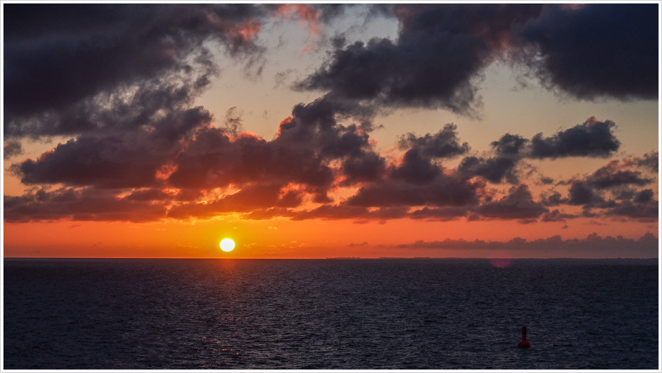Wenn man aber auf dem Schiff unterwegs ist, der Sonnenaufgang quasi frei Haus, direkt auf den Balkon geliefert wird und man sowieso kurz wach ist, weil man ein menschliches Bedürfnis verspürt, wäre es sträflich die Situation zu ignorieren.