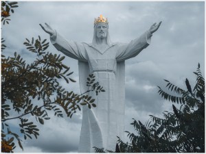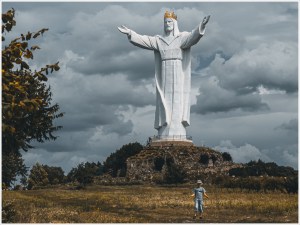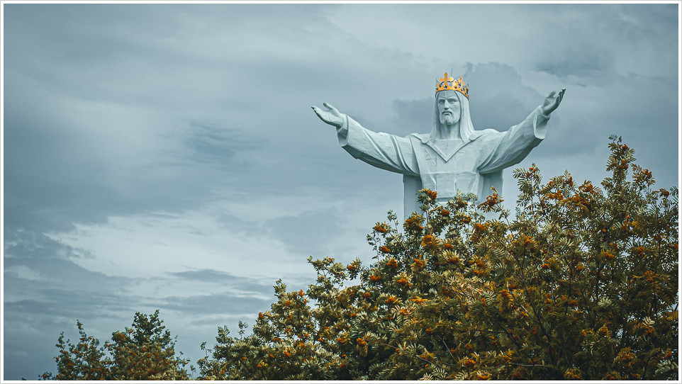 Die Statue an sich ist schon ein echter Hingucker, streckt sich 36 Meter hoch in den dramatischen Himmel und in der Nachmittagssonne leuchtet die goldene Krone verheißungsvoll. Damit ist sie die höchste Christusstatue der Welt. Gebaut wurde die Figur 2010 auf Veranlassung des umtriebigen Gemeindepfarrers Sylwester Zawadzki, Bildhauer war Mirosław Kazimierz Patecki. Die Blickrichtung der Christus-König-Statue ist nach Westen ausgerichtet und der künstlich angelegte Hügel wird dabei von fünf Ringen umgeben. Die Ringe stehen symbolisch für die erlösende Rolle Christi auf den fünf Kontinenten der Erde.