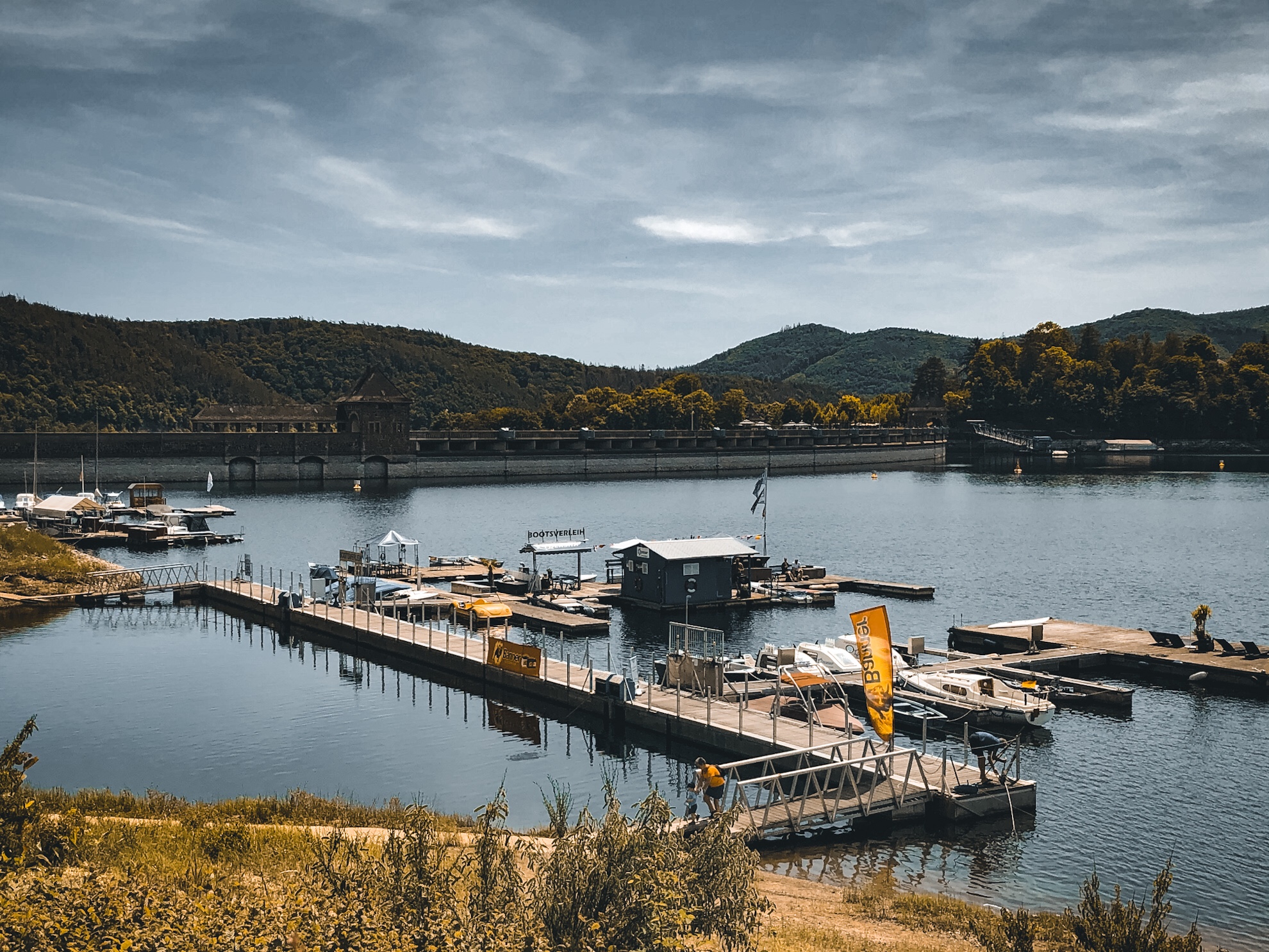 Die 48 Meter hohe Staumauer sorgt dafür, dass das Wasser der Eder hier gestaut wird und somit ein Freizeitparadies für Wassersport aller Art entsteht. Es ist der drittgrößte Stausee Deutschlands. Auch viele Stell- und Campingplätze gibt es rund um den Edersee, auf einem davon, der Edersee-Alm stehen wir gerade und genießen den Ausblick über den See, bis zum Schloss Waldeck. Mit zwei Radtouren haben wir den See schon umrundet, das Titelbild entstand gestern spontan mit der Drohne.