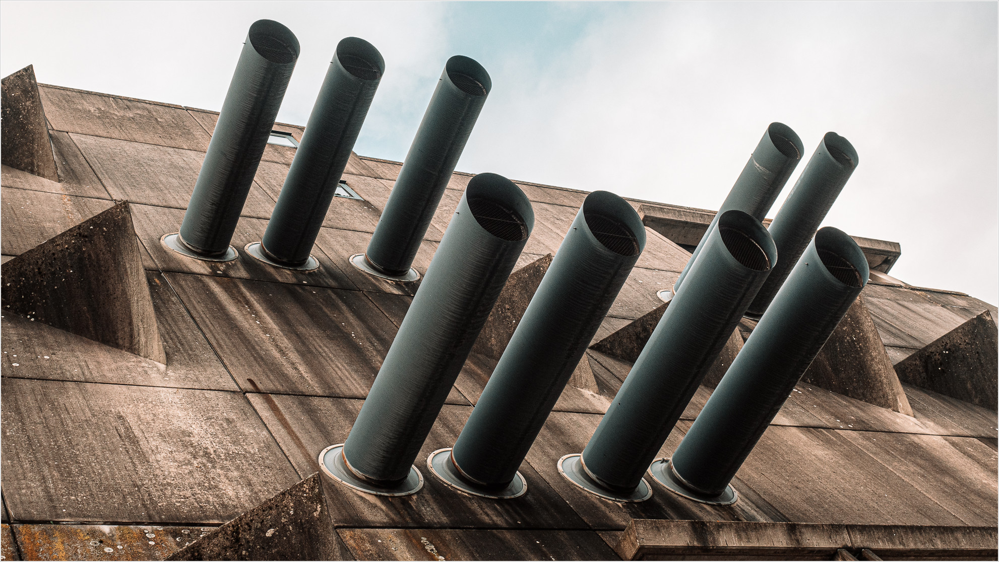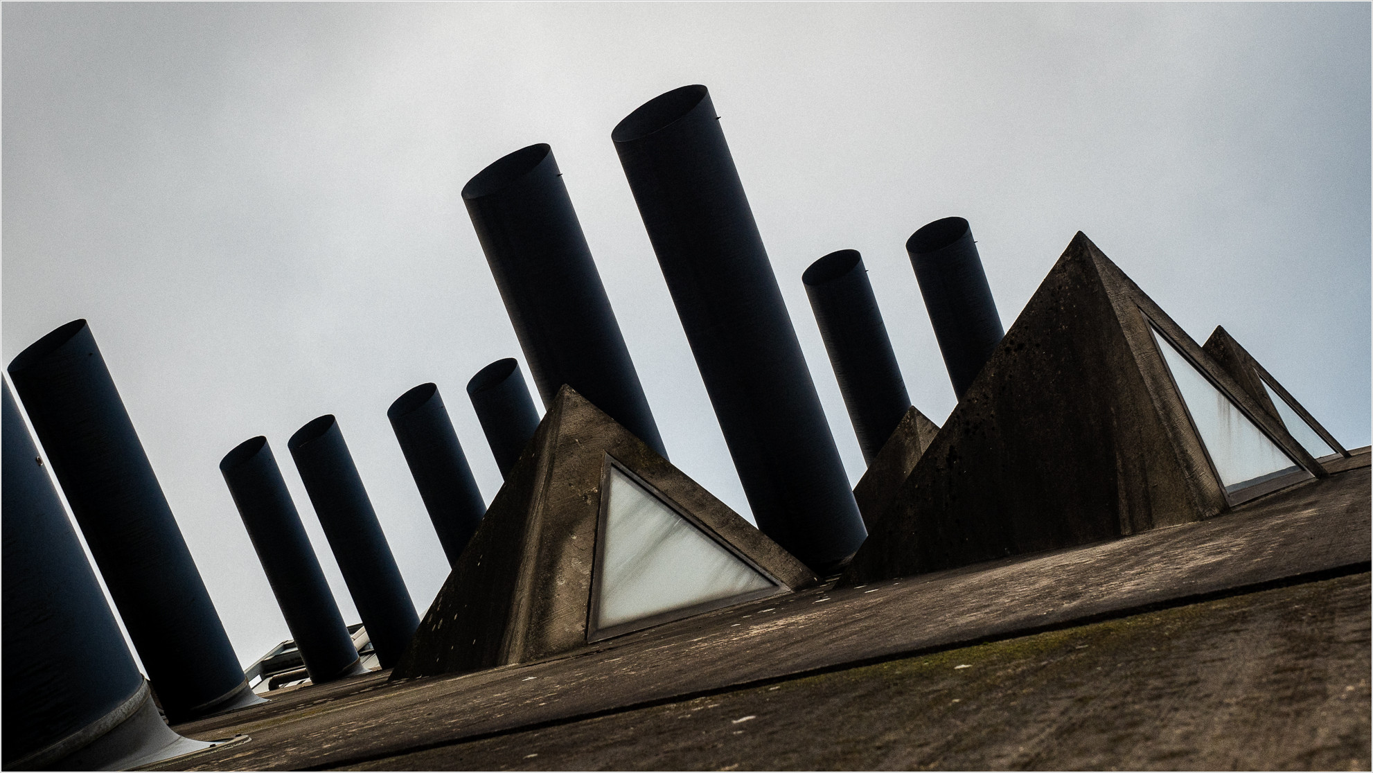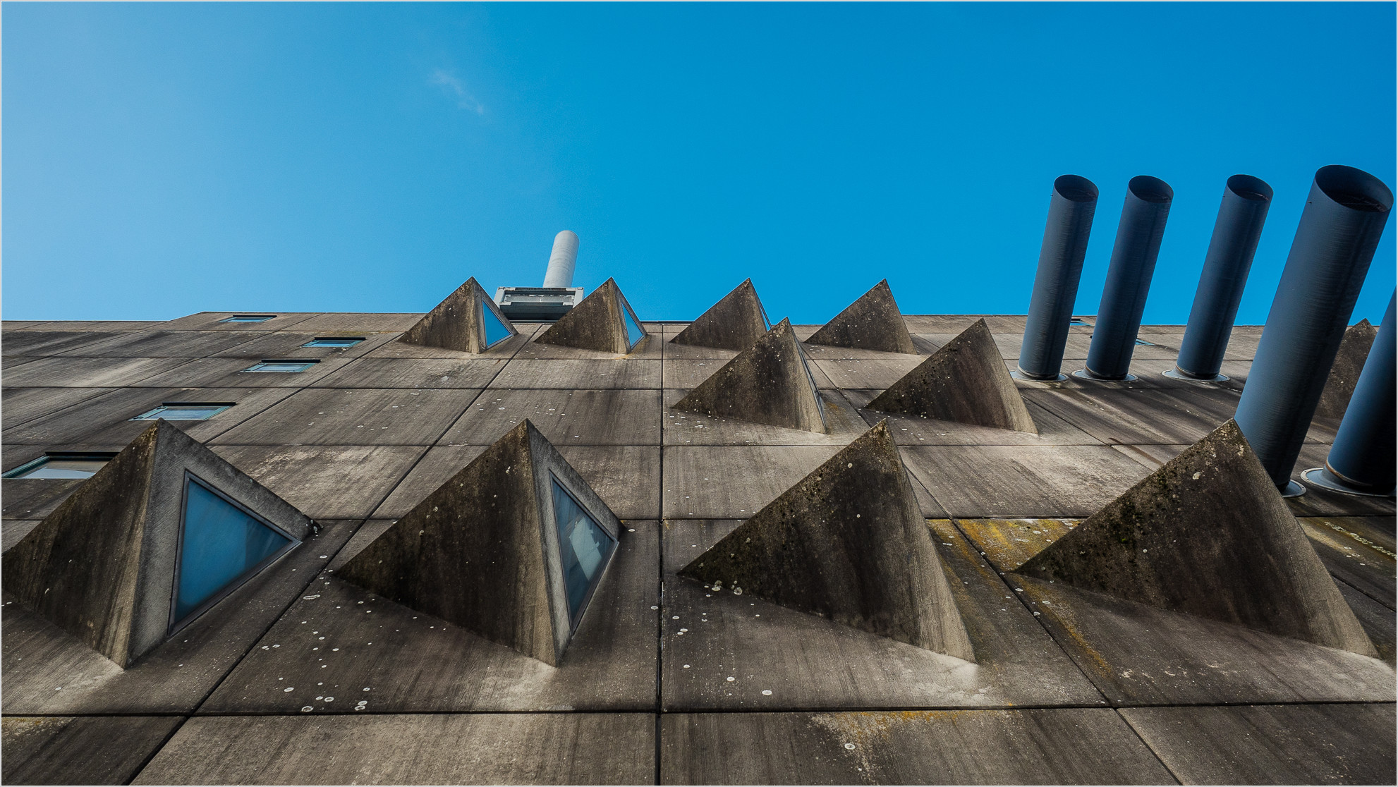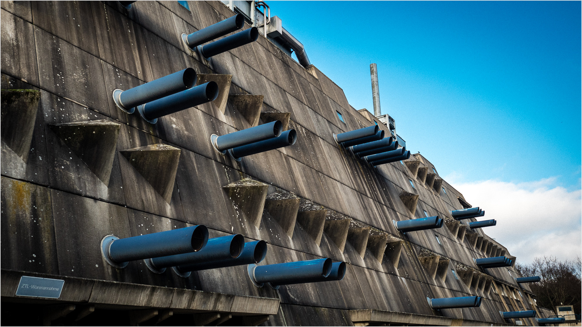 Die aus dem Gebäude ragenden blauen Belüftungsrohre geben dem Ganzen einen sehr martialischen Anstrich. Richtig fotografiert könnten es auch die Kanonen eines Piratenschiffes, oder eines Schlachtkreuzers aus früheren oder kommenden Kriegen sein. Der nackte Beton und die wenigen Fenster, die als Tetraeder an der Wand kleben, verstärken den Eindruck eines äußerst wehrhaften Objektes.
