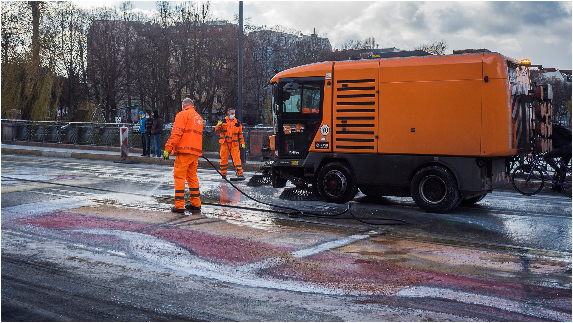 Leider war ich ein wenig zu spät. Als ich mit meiner Drohne an der Brücke ankam – wäre sicher eine coole Aktion gewesen – konnte ich nur noch Spuren des Kunstwerks sehen, der Rest war bereits den Saubermachern der Stadtreinigung und den FFF Leuten zum Opfer gefallen. Verständlich, wäre die Farbe doch sonst zu einer Gefahr für Rad- und Autofahrer geworden. So reichte es immerhin noch für ein paar Bilder mit der „normalen“ Kamera.
