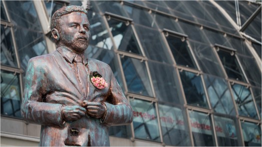 Dort wo eigentlich das Herz sitzt befindet sich ein Loch, in das die Fans Geschenke werfen dürfen. Als ich vor Ort die Fotos gemacht habe, kamen gerade zwei Freundinnen und füllten das Loch mit einem Strauß Nelken. Mit dem Flaschenöffner an der Jackentasche und einem Garderobenhaken an der Rückseite, ist die Figur damit mehr oder weniger interaktiv. Hier noch das Video zur Feier der Übergabe.