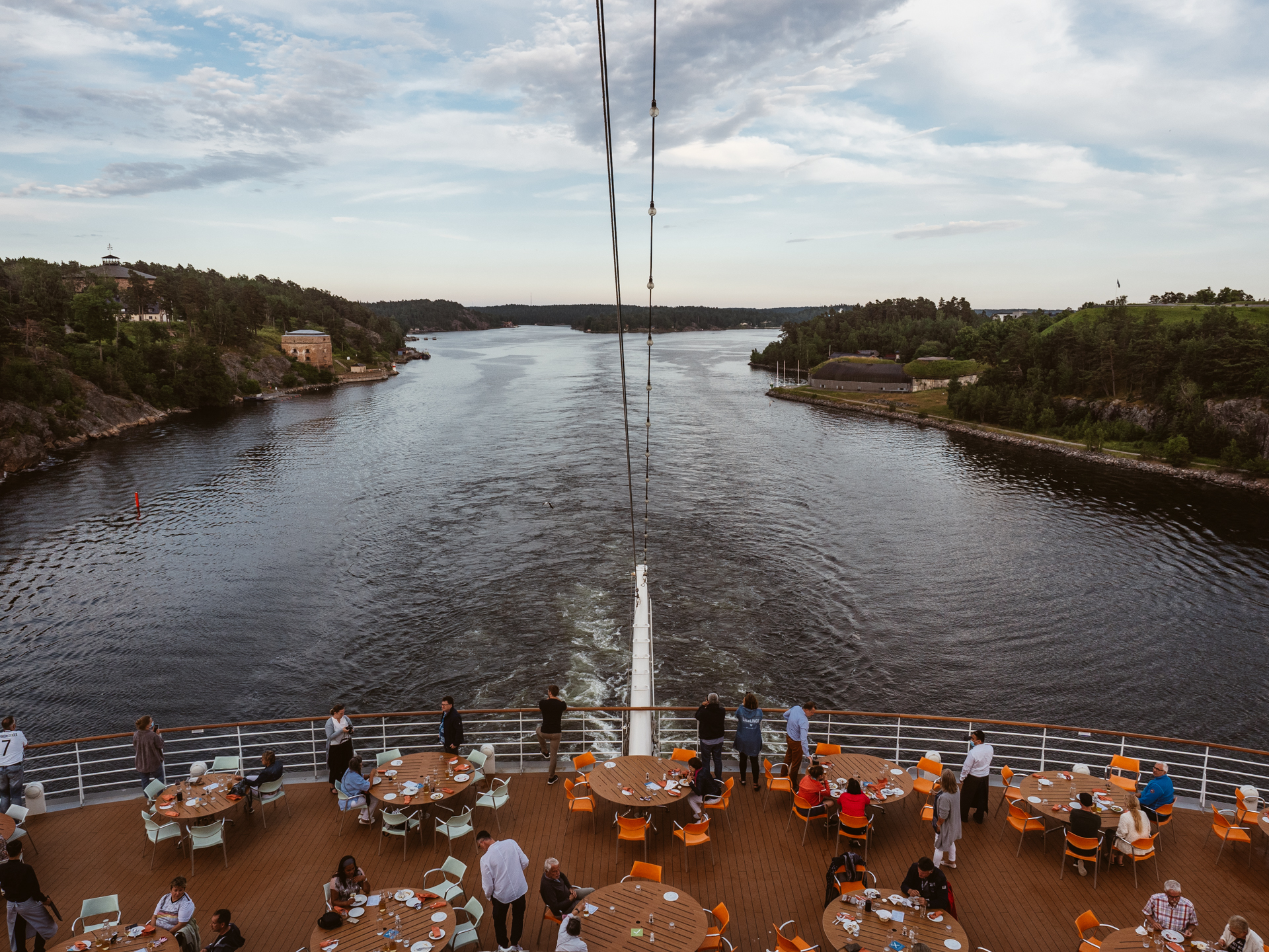 Während am Abend die „Die Mannschaft“ eins von England auf die Nase bekommt – Public Viewing für die Passagiere gibt es auf dem Pooldeck – machen wir’s uns in der OceanBAR mit Cocktails gemütlich und genießen die lange Ausfahrt durch die Schären. Spektakulär anzuschauen, wenn es durch enge Durchfahrten geht, rechts und links begleitet mit den roten Ferienhäuser der Stockholmer.