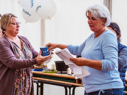 Letztere hätte es gar nicht gebraucht, da uns Hobby – dank der Überredungskünste der Organisatorin – tatkräftig für die Veranstaltung unterstützt hat. So kann jedem Teilnehmer eine der begehrten Hobbytassen mit einem Schlüsselanhänger übergeben werden. Die Helfer bekommen noch einen Wunderkarton mit aufblasbarem Hobby-Equipment, dann muss endlich der Kuchen dran glauben.