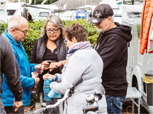 Die ersten Ankömmlinge sitzen am Freitag bereits an der langen Kaffeetafel zwischen den Wohnmobilen, als aus dem Tröpfeln ein stetiger Strom wird. Nun geht es Schlag auf Schlag. Immer wieder werden Neuankömmlinge empfangen und Stellplätze zugewiesen. An manchen Stellen wird umrangiert um Platz zu gewinnen. Kuscheln ist angesagt. Am Ende des Tages haben alle ihr Plätzchen gefunden, haben sich eingerichtet und genießen die späte Herbstsonne.