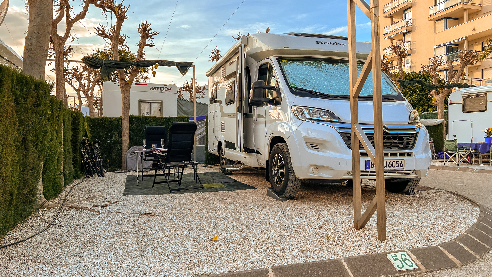 Leichte Panik macht sich breit, wir haben keinen Plan B in der Tasche. Also wir versuchen es mit dem letzten Platz, einem Eckgrundstück mit der Nummer 56 – immerhin mein Geburtsjahr. Hier ist nicht das einparken das Problem, sondern eher, wie weit kann ich mit dem Wohnmobil nach innen auf den Platz kommen. Mit der Hilfe von Ulla und einem anderen Camper bekommen wir das dann hin. Wir stehen. Nicht sonnenoptimal, aber immerhin. Der Platz ist ausbaufähig. Immerhin hat es heute 23 Grad in Calpe. Was wollen wir mehr. Ein Einkaufsmarkt ist direkt gegenüber des Platzes, leider aber auch drei neue Hochhäuser an denen fleissig und lautstark den ganzen Tag gewerkelt wird. Uff. Is ja knorke, wie in Berlin, wa. Überall wird jebaut. Aber sind ja bald Feiertage, da ist dann Ruhe.