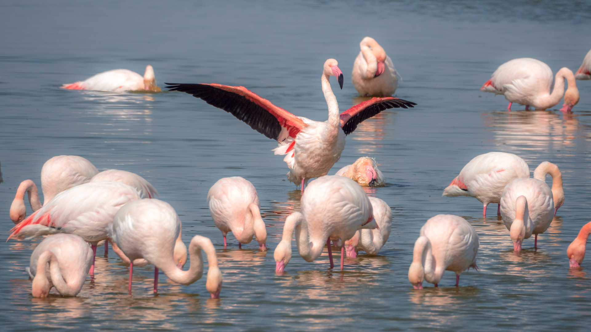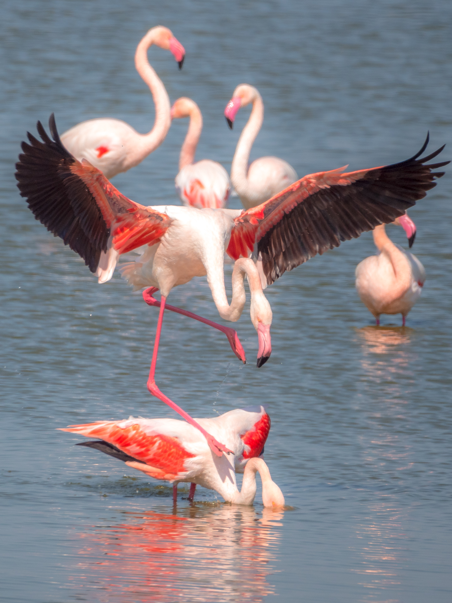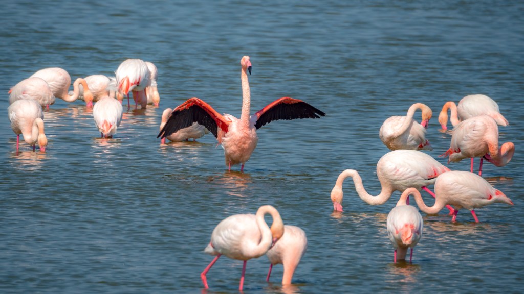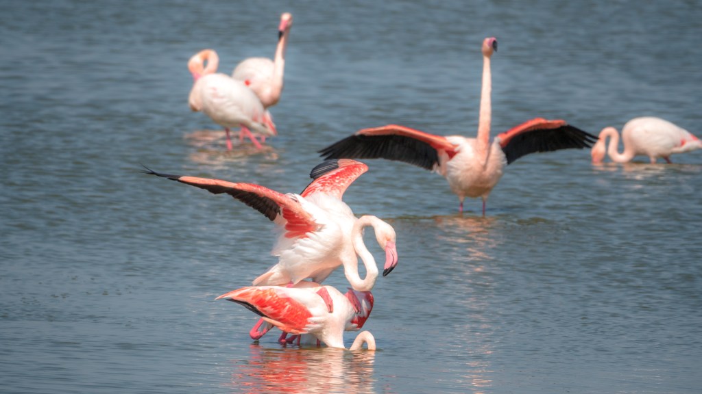 Ich setze mich an den Rand des Wasserlaufs und beobachte die „äsenden“ Flamingos. Heißt das eigentlich so? Die meiste Zeit stecken sie jedenfalls mit dem Kopf im Wasser und schuffeln mit den Füßen den rosa Krill aus dem Boden um ihn zu fressen. Irgendwo muss die rosa Farbe der Flamingos ja herkommen. Zwischendurch wird sich gewaschen, geputzt und aufgeplustert. Das recken und trocknen der mächtigen Flügel gibt wieder tolle Fotos. Es hat sich heute auf jeden Fall gelohnt, den Weg auf sich zu nehmen, um die farbenprächtigen Flamingos zu bewundern und natürlich zu fotografieren.