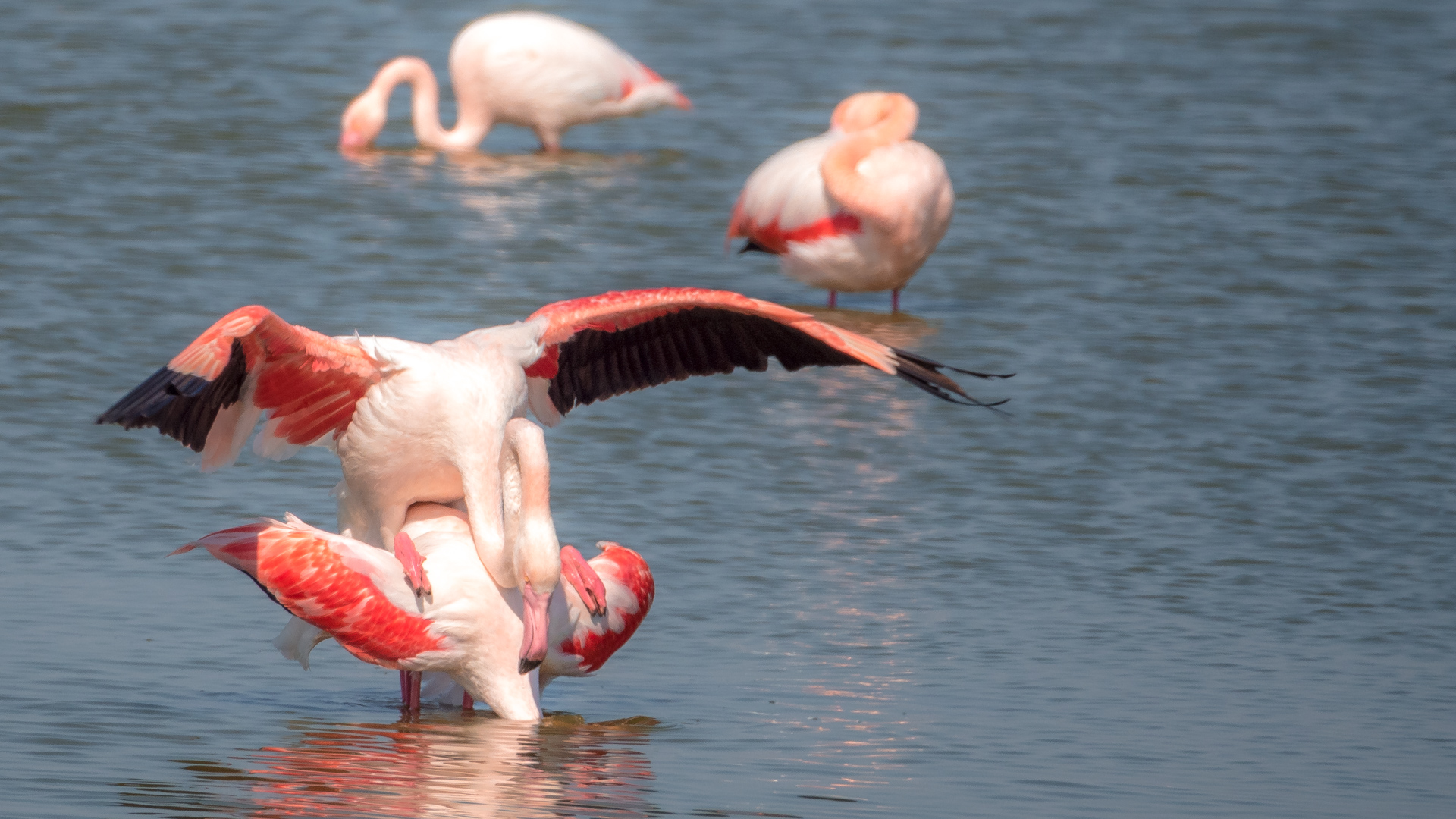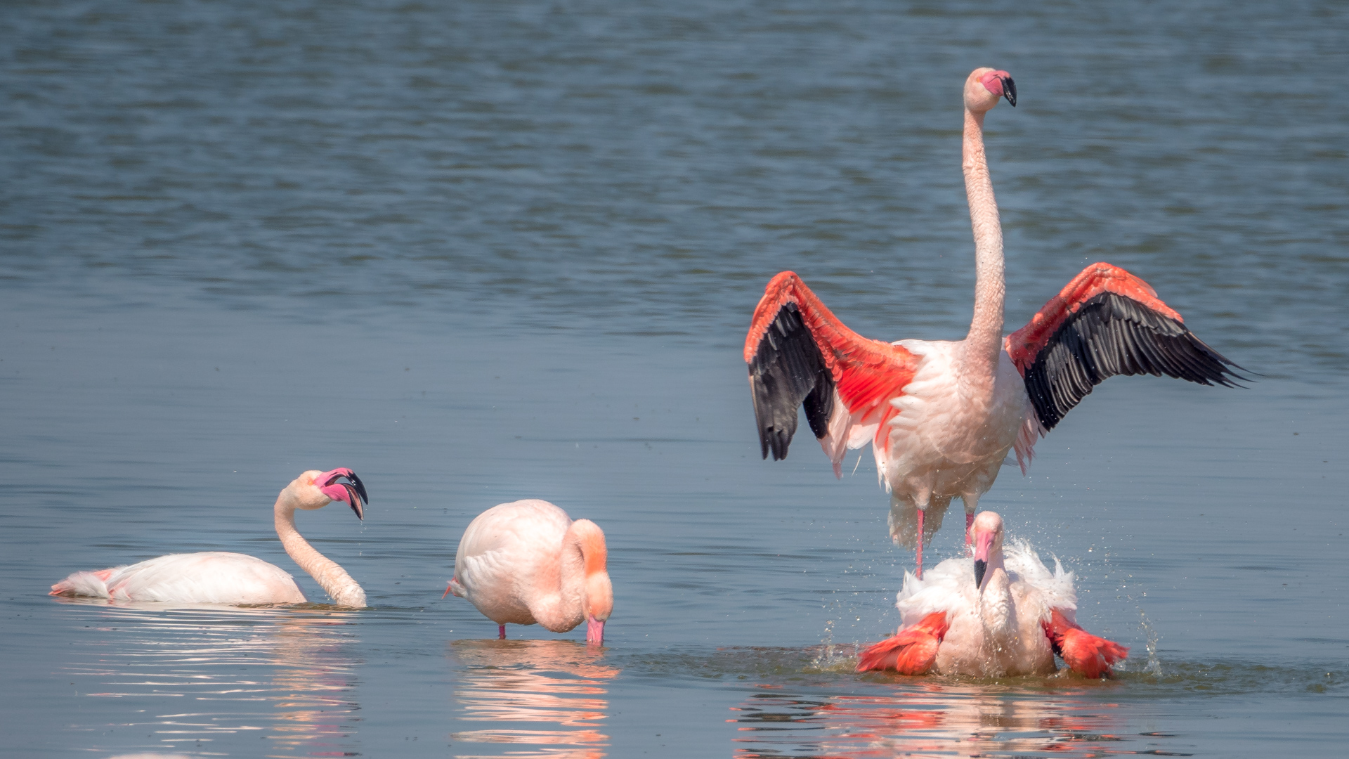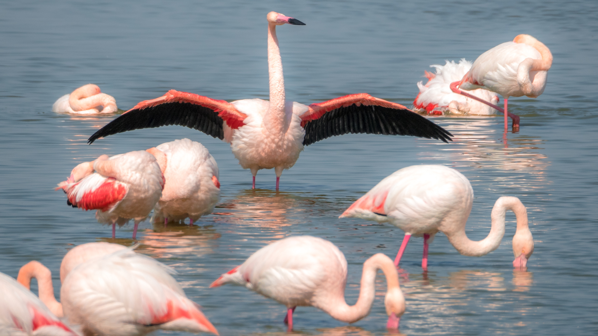 Ich setze mich an den Rand des Wasserlaufs und beobachte die „äsenden“ Flamingos. Heißt das eigentlich so? Die meiste Zeit stecken sie jedenfalls mit dem Kopf im Wasser und schuffeln mit den Füßen den rosa Krill aus dem Boden um ihn zu fressen. Irgendwo muss die rosa Farbe der Flamingos ja herkommen. Zwischendurch wird sich gewaschen, geputzt und aufgeplustert. Das recken und trocknen der mächtigen Flügel gibt wieder tolle Fotos. Es hat sich heute auf jeden Fall gelohnt, den Weg auf sich zu nehmen, um die farbenprächtigen Flamingos zu bewundern und natürlich zu fotografieren.