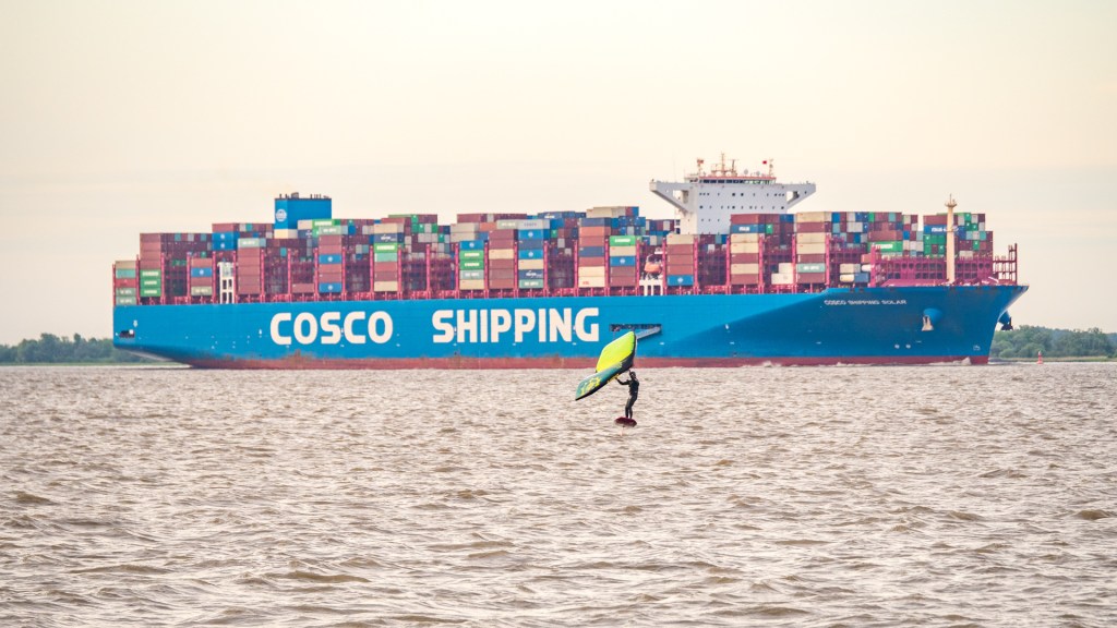 Wenn dem Fotografen dann noch ein einsamer Surfer als Vordergrund vor die Linse fährt, der die Dimensionen dieser Schiffe noch deutlicher hervortreten lässt, ist das schon fast ein Glückstreffer. Noch dazu, wenn die begleitende Ehefrau am Strand der Elbe bittet, doch die Bilder des surfenden Mannes geschickt zu bekommen. Das mach ich doch gerne.
