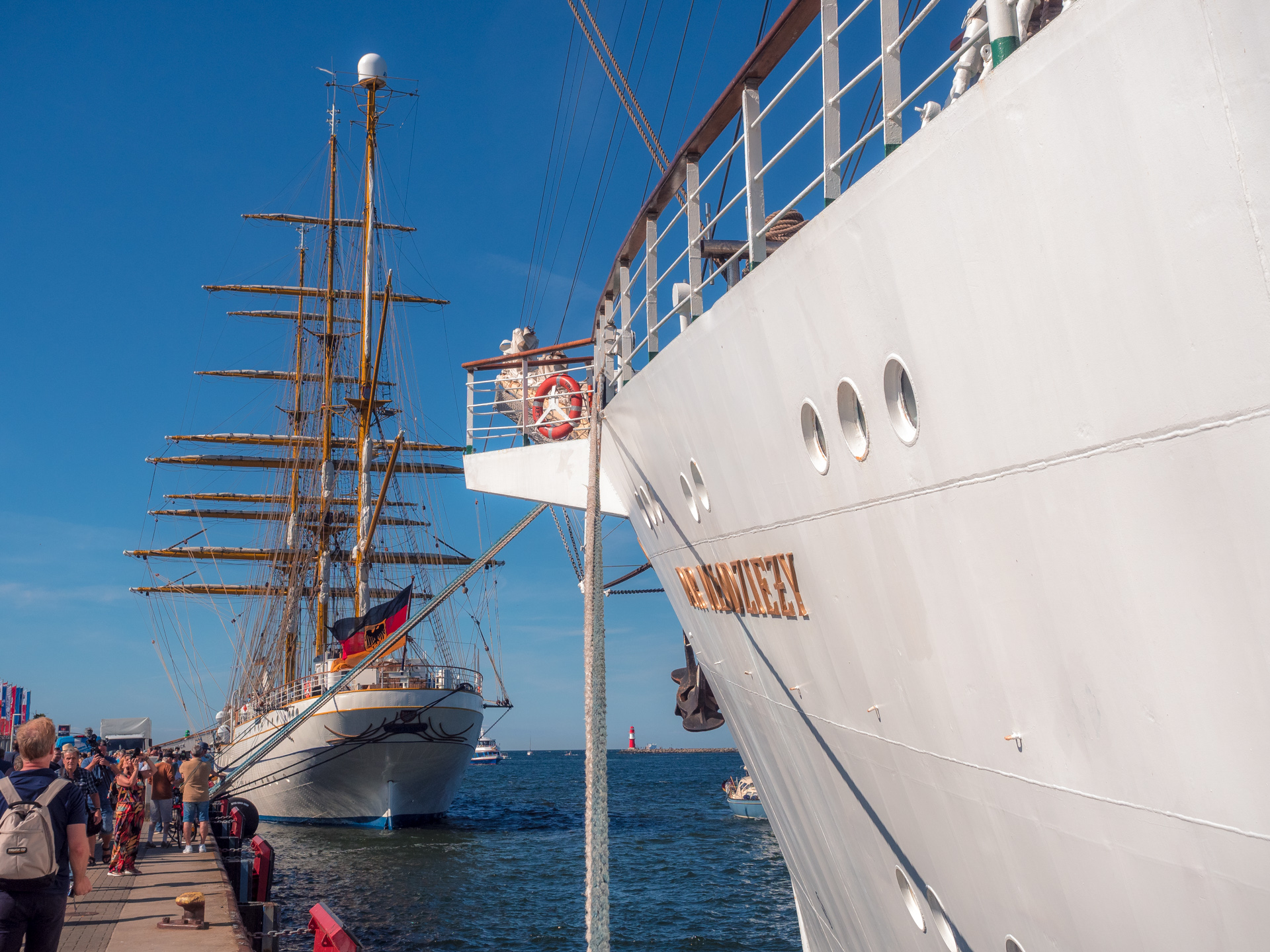 Ab Dienstag trafen dann mehr und mehr Segelschiffe in Warnemünde ein. Ein Teil lag direkt vor unserem Stellplatz, so die J.R. Tolkien, ein anderes Segelschiff, die Großherzogin Elisabeth lag am Stellplatz 7, direkt vor dem Kreuzfahrt-Terminal. Ein Teil fuhr durch bis zum Stadthafen nach Rostock. Die Schiffe nutzen die Gelegenheit Segelturns anzubieten und verdienen sich so ein bißchen Geld für die Instandhaltung der Schiffe. Hab ich ja auch schon zweimal genutzt. Dieses mal wollte ich aber nur schauen, nicht fahren.