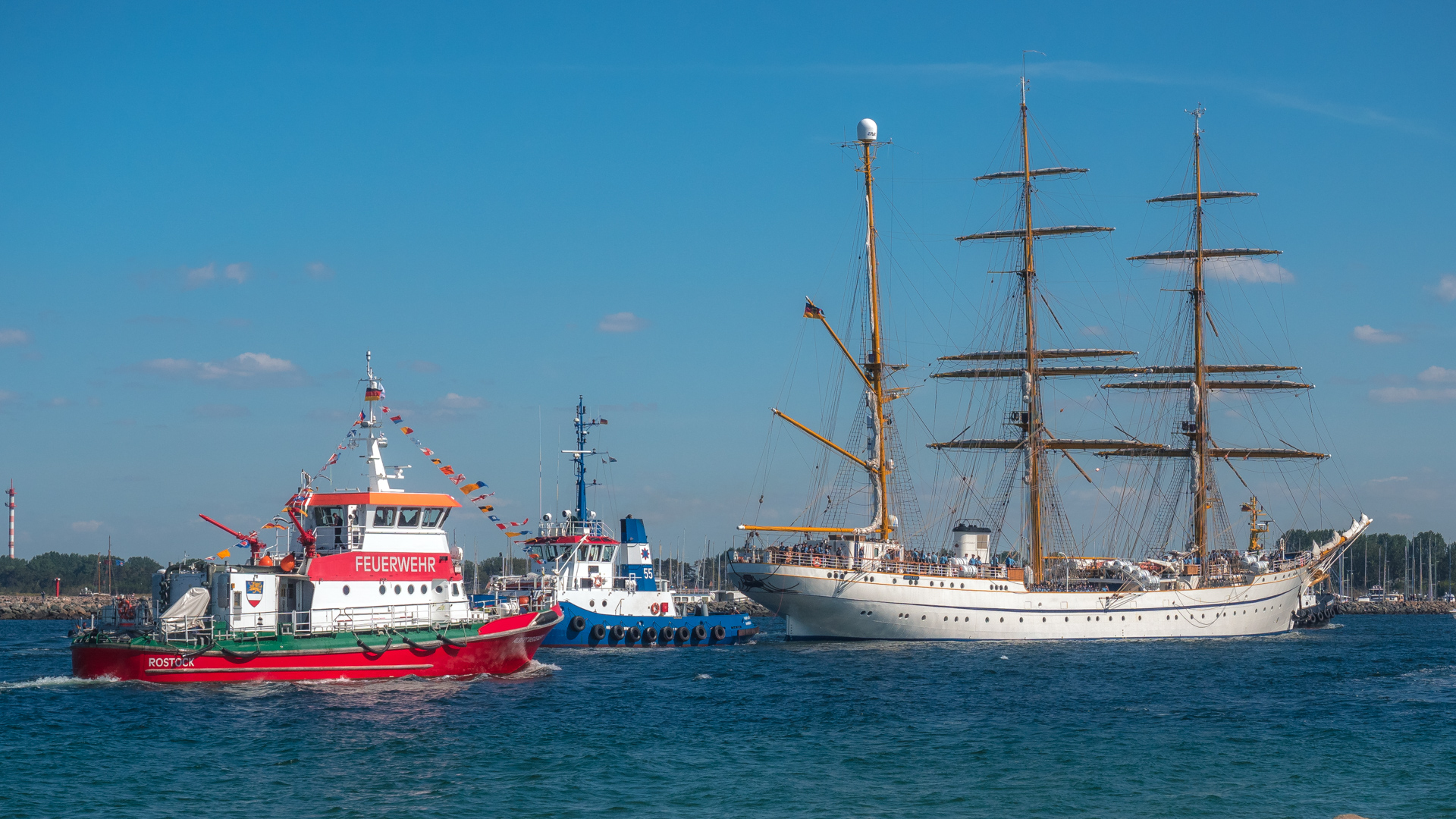 Die Hoffnung der Zuschauer am grünen Leuchtfeuer, dass die Gorch Fock vor dem Einlaufen noch auftakelt, erfüllten sich leider nicht, auch sie kam „nur“ mit leeren Masten und mit Motor. Obwohl sich der Wind in Grenzen hielt, ist es vielleicht ein Wagnis unter vollen Segeln in einen „engen“ Kanal einzufahren. Seit 7 Jahren nimmt die Gorch Fock damit wieder an der Hansesail in Warnemünde teil. Begleitet vom wassersprühenden Feuerwehrboot, und gezogen von einem Bugsier passierte sie kurz vor 16 Uhr die beiden Leuchtfeuer von Warnemünde.