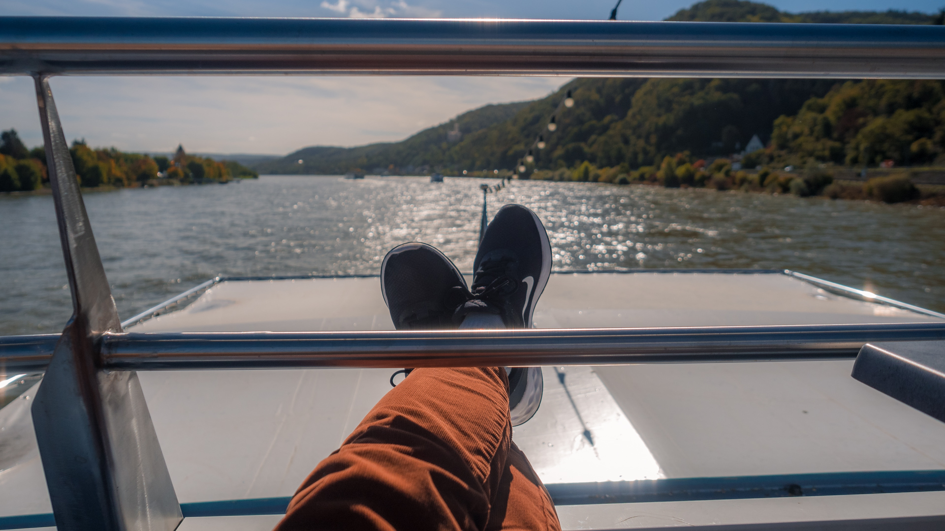 Da wollen wir heute morgen gemütlich mit der Seilbahn vom Deutschen Eck zur Feste Ehrenbreitstein hochschweben, aber die Kabinen stehen über dem Rhein still. Wassn los? Ruhetag? Kaputt? Och neee. Irgendwie ist auch abgesperrt und Polizei steht rum. Kurz danach kommen auf einmal Polizeimotorräder, Limousinen und darin das belgische Königspaar um die Ecke. Die sind grad auf Rheinland-Pfalz Besuch und heute ist ein Essen auf der Feste Ehrenbreitstein angesetzt. Da es zeitlich gerade passt, schieben wir halt noch eine kleine Schiffstour dazwischen. Bis wir zurück sind, sollten Königs hoffentlich die Burg erreicht haben. Also eine Stunde Schifffahrt auf dem Rhein, warum auch nicht.