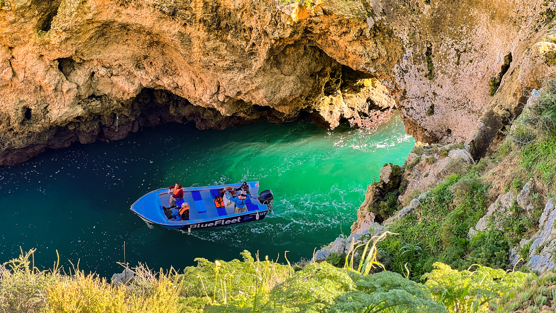 Im Winter sind es davon nicht so viele, daher bin ich schon wieder oben auf den Klippen (Puls auf 148 😉 ), als dann doch ein Boot den Weg in die Grotte findet. Aber auch von oben lässt sich das gut fotografieren. Mit ein wenig vorsichtigem kraxeln kommt man auch auf die äußere Klippe. Ich drücke Ulla die Kamera in die Hand und bitte sie ein Scherenschnitt von mir, mit dem endlosen Atlantik im Hintergrund zu schneiden. Hat super geklappt.