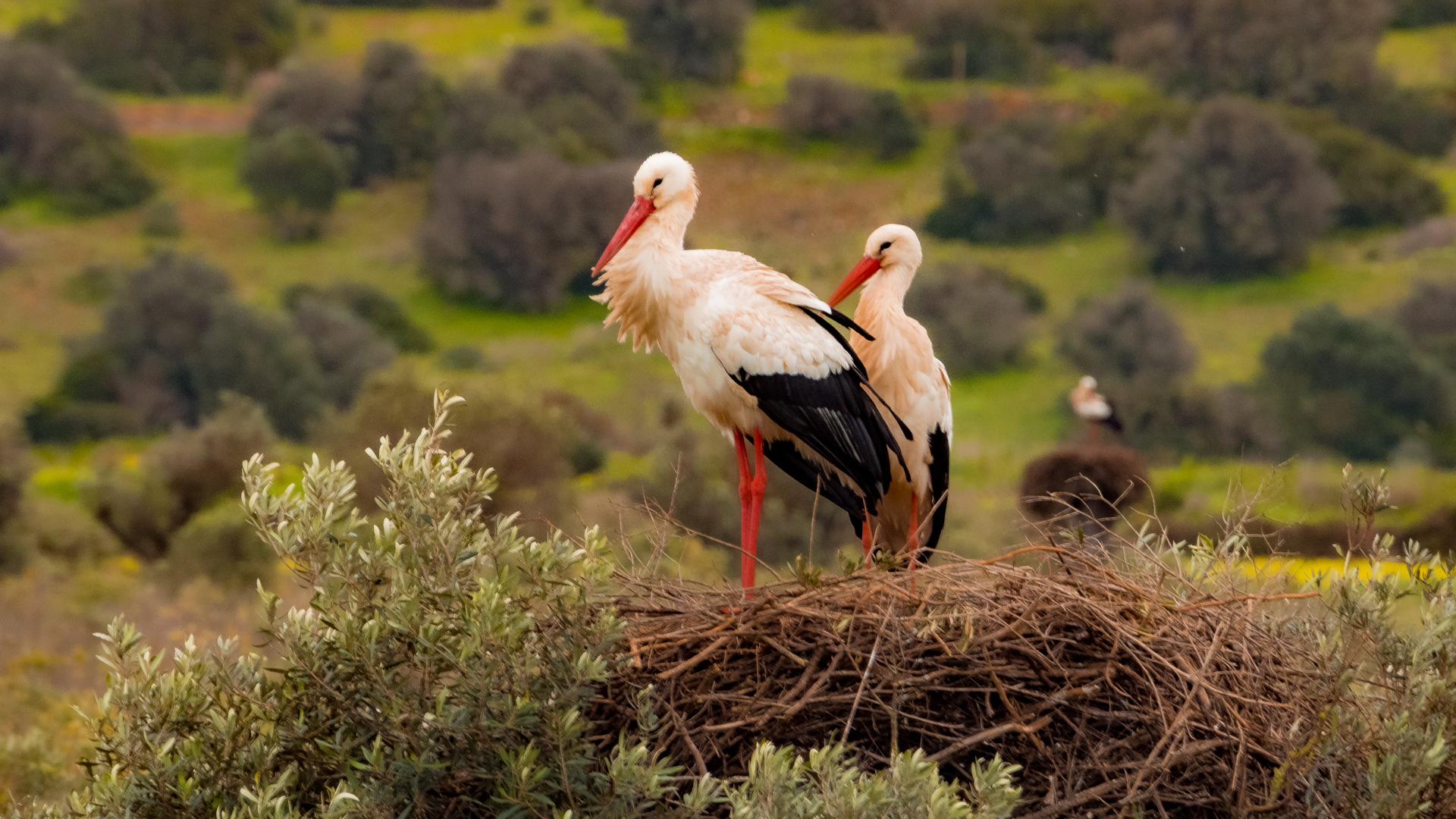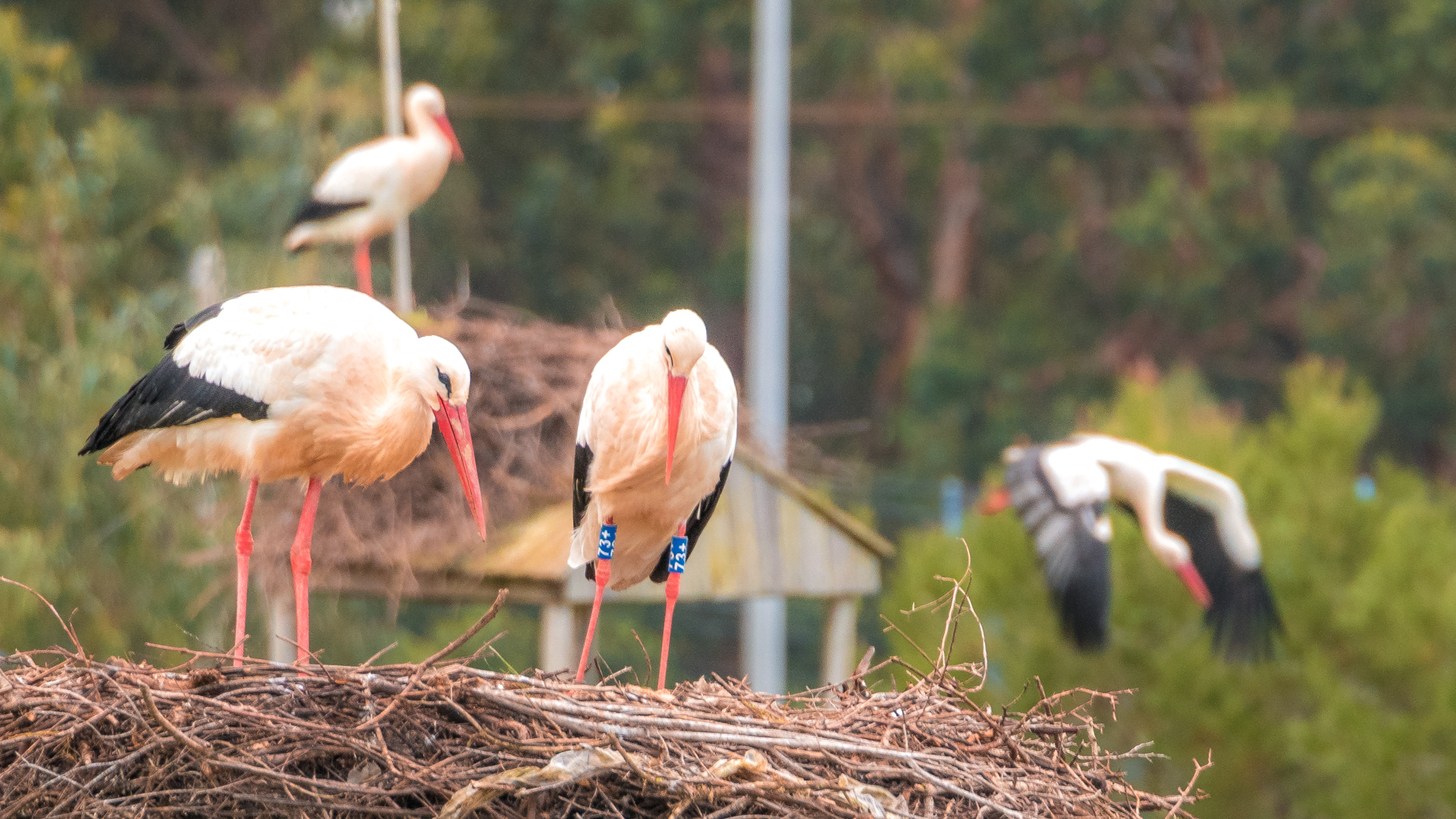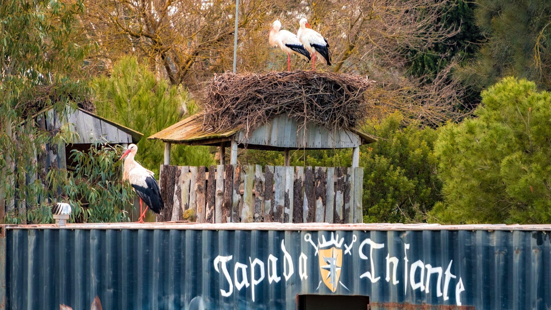 Vielleicht ist es den Störchen hier in Portugal warm genug, so dass sie den Flug weiter nach Afrika nicht mehr auf sich nehmen müssen. Vielleicht sind sie aber schon immer hierher gekommen und fühlen sich wohl. Im Umfeld sind kleine Teiche, in denen es sicher leckere Frösche und Insekten für den Nachwuchs gibt. Gut für mich und meine Kamera.