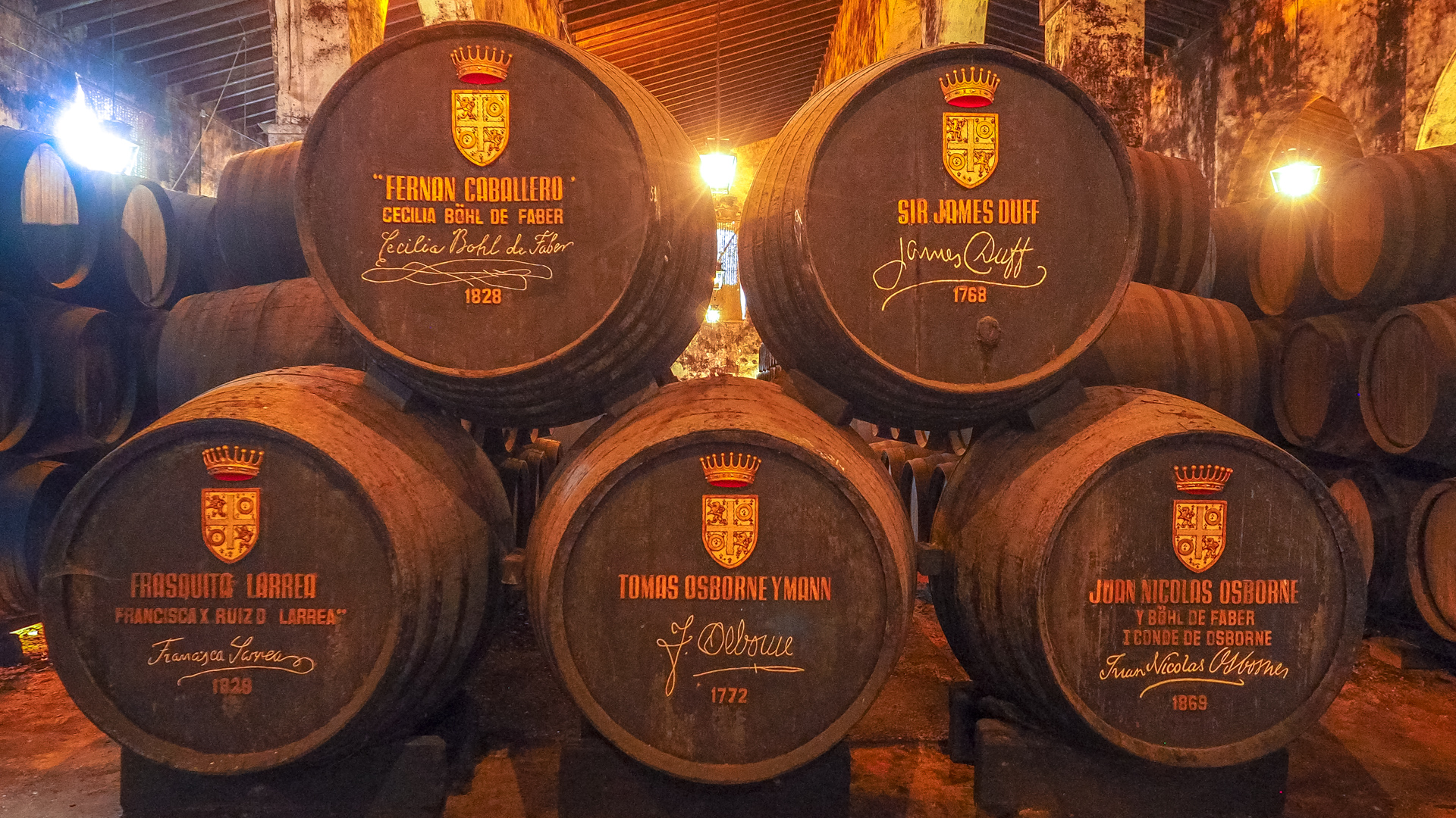 In hunderten Fässern reifen in der „Winery“ in „El Puerto de Sta María“, einer kleinen hafenstadt gegenüber von Cadiz, verschiedene Sherry Sorten. Beim Eintritt in die riesige Halle mit mehr als 600 Fässern, riecht es sofort nach Wein und wir bestaunen die teilweise hundert Jahre alten Fässer aus amerikanischer Eiche. In drei Reihen stehen sie übereinander und werden nach einem bestimmten Prinzip gelagert. Die untere Reihe beherbergt gut 30 Jahre alten Sherry, darüber der Mittelalte und ganz oben der jüngere Sherry. Entnimmt man unten Sherry zum Befüllen in Flaschen wird aus der Mitte nachgefüllt, die wiederum aus der oberen Reihe aufgefüllt wird. Ein ausgeklügeltes System der Lagerung und Reifung von Sherry.