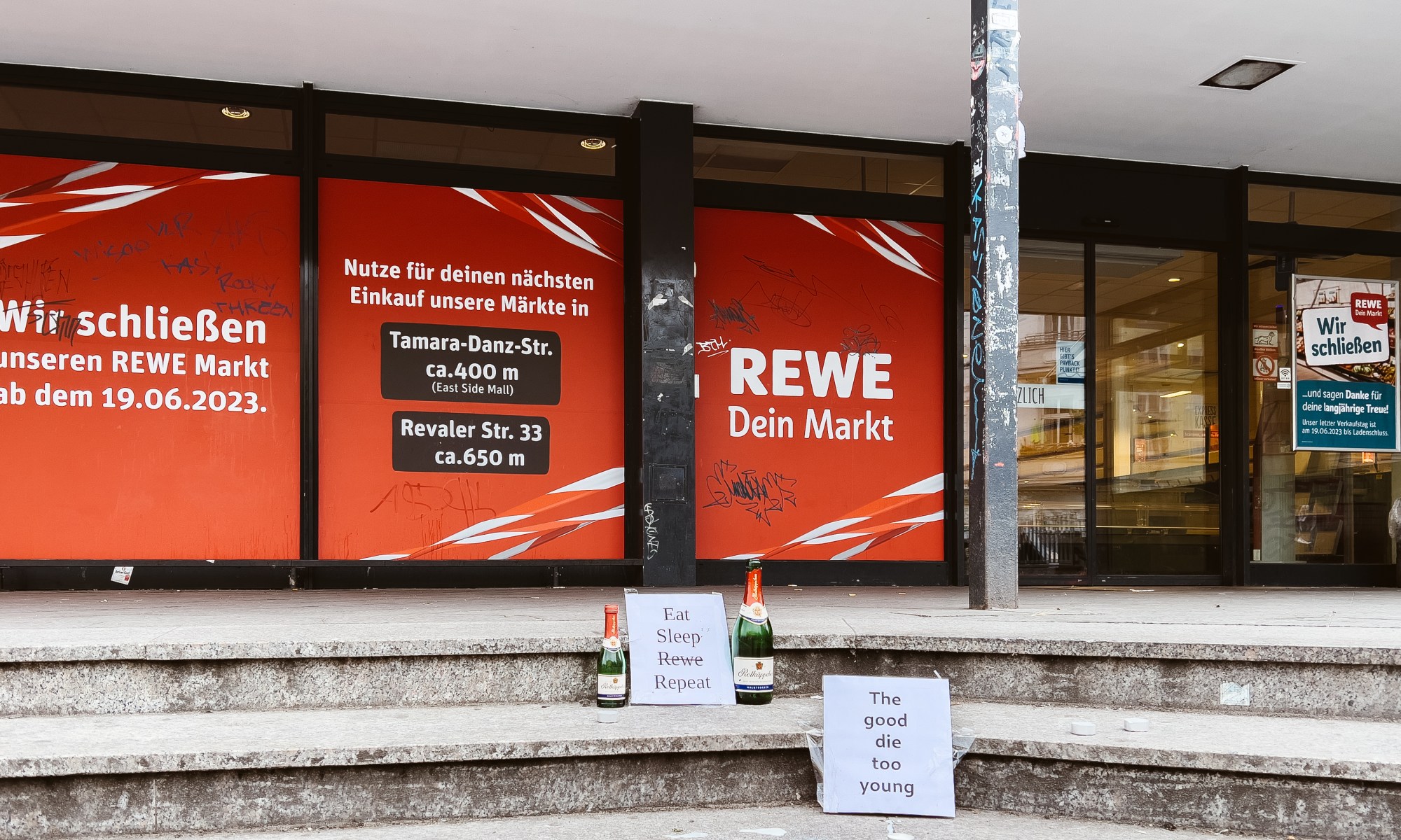 Verwirrte Menschen irren auf den Treppenstufen des ehemaligen REWE an der Warschauer Straße herum, versuchen die Tür zu öffnen, schauen ungläubig durch die Scheiben in das Innere, nur um dort Mitarbeiter zu sehen, die dabei sind entgültig die Regale auszuräumen. Auf den Stufen stehen Sektflaschen und Trauerschilder. Seit gestern ist Schluss mit dem „Party-Rewe“, der früher mal der „Party-Kaisers“ war und noch viel früher eine Kaufhalle.