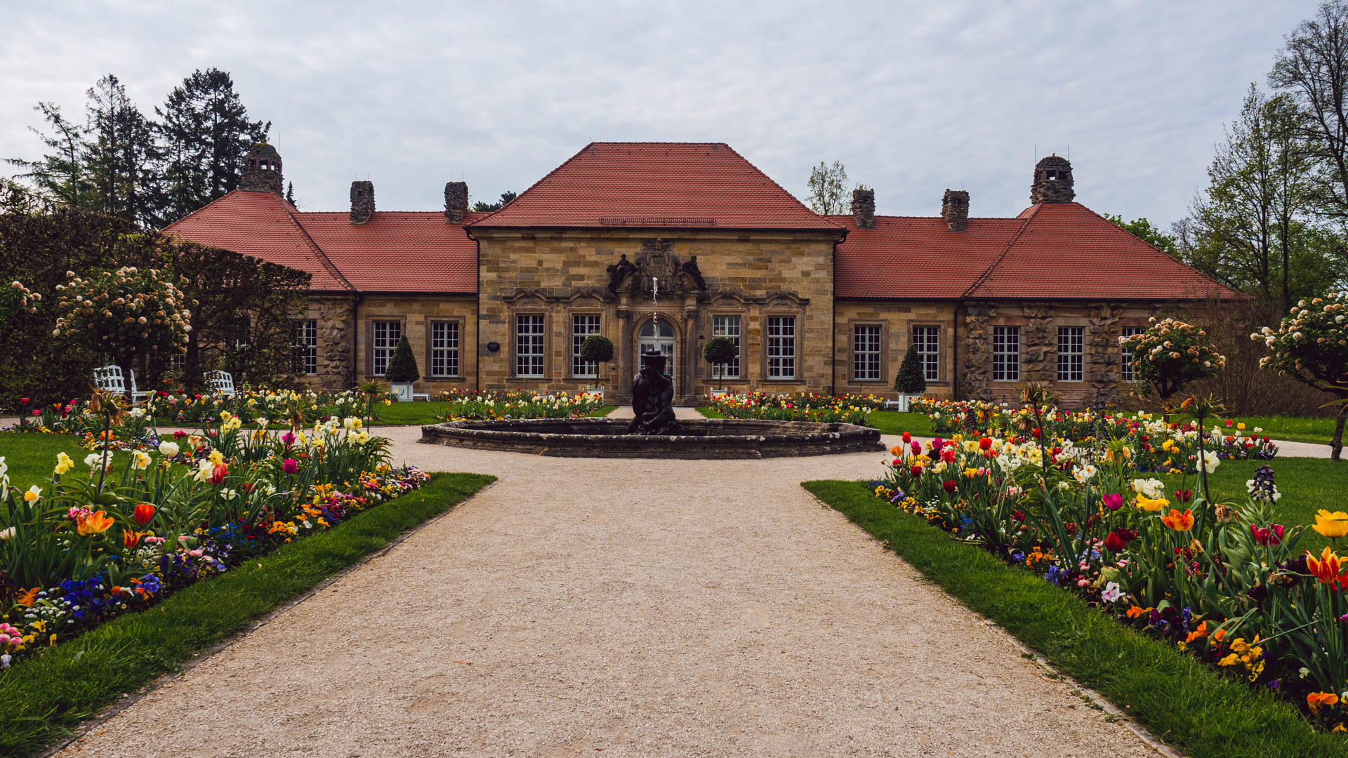 „Sie liegt auf einem Berge, zu dem eine Allee und eine Chaussee, die der Markgraf anlegen ließ, emporführen. Am Eingang steht der Berg Parnaß, eine Halle, auf der man Apollo und die neun Musen Wasser ausgießen sieht. Das Haus (Altes Schloss) zeigt nach außen keinerlei architektonischen Zierat; man könnte es für eine von Felsen umgebene Ruine halten; es ist von einer Anzahl hochstämmiger Bäume umringt. Vor der Front des Hauses ist ein kleines blumenbesätes Beet, und am Rande desselben strömt eine scheinbar dem Felsen entspringende Kaskade den Berg hinab, wo sie in ein weites Bassin hineinstürzt; zu beiden Seiten ziehen sich hier hohe Linden entlang, und es sind Stufen angelegt, um bequemer hinabsteigen zu können.“ So beschreibt die Markgräfin Wilhelmine in ihren Memoiren die Eremitage in Bayreuth im Jahre 1744. Das „neue Schloss“ (Titelbild) mit dem markanten Sonnentempel in der Mitte kam etwas später dazu.