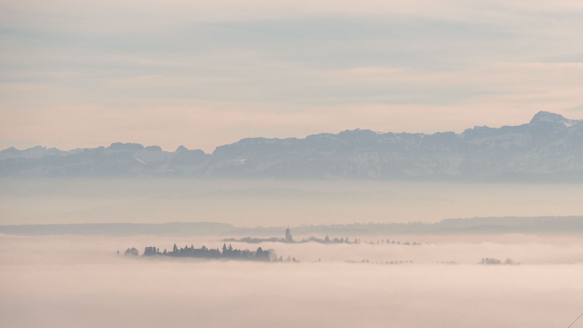 Wir wären auch gern noch etwas länger geblieben, mussten aber dringend einkaufen. Später hat es die Sonne dann doch noch geschafft, den Nebel auf den unteren Bereich des Bodensees zu begrenzen. So konnte ich von der Aussichtsterrasse des Q5 direkt gegenüber unserer Wohnung das Titelbild mit dem Überlinger Münster zu schießen, vor dem Nebelmeer und den dahinterliegenden Alpen. Auch ein toller Ausblick. Die Insel Mainau ragte dann gerade so aus dem Nebel, dass sie zu schweben schien. Insgesamt sehr mystische Tage hier am Bodensee.