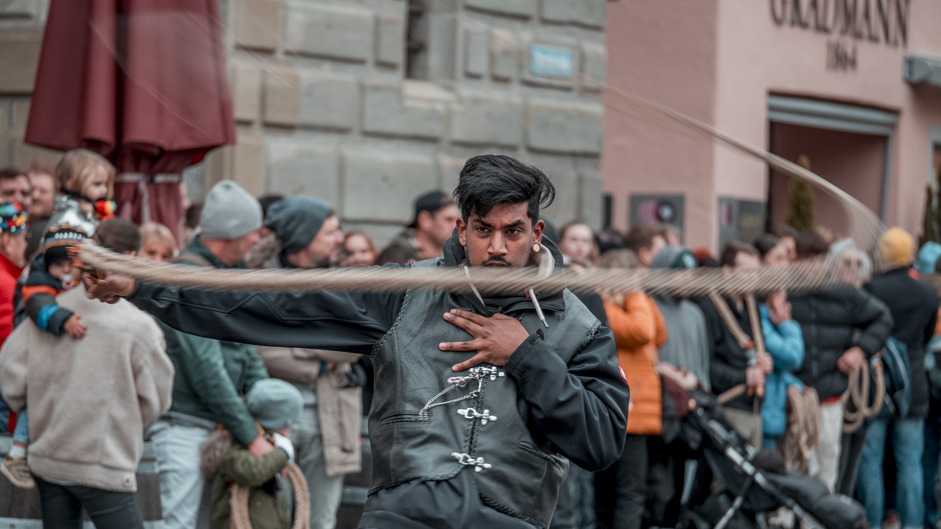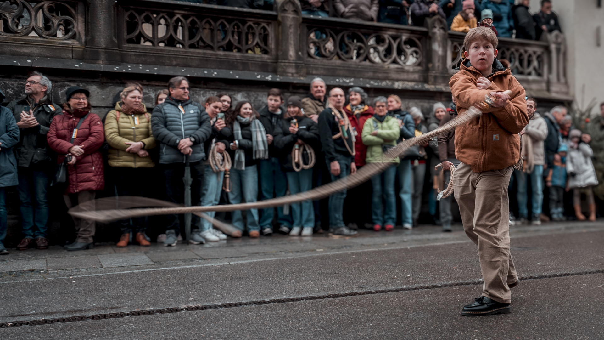 Die Fußstellung hat mich dabei ein wenig an den Abschlag beim Golf erinnert, aber der ganze Bewegungsablauf muss stimmen, ansonsten klappt das nicht mit dem Überschallknall. Auf jeden Fall bin ich froh, trotz des eher mäßigen Wetters, den Weg in die Unterstadt auf mich genommen zu haben. Ein grandioses Spektakel, ein Höllenlärm, genau richtig um in die fünfte Jahreszeit einzusteigen. Ich bin sehr gespannt, was mich in dieser Kampagne noch erwartet und ihr dürft gespannt sein auf weitere Berichte und Bilder, einer für mich fremden „Fasnetzeit“.