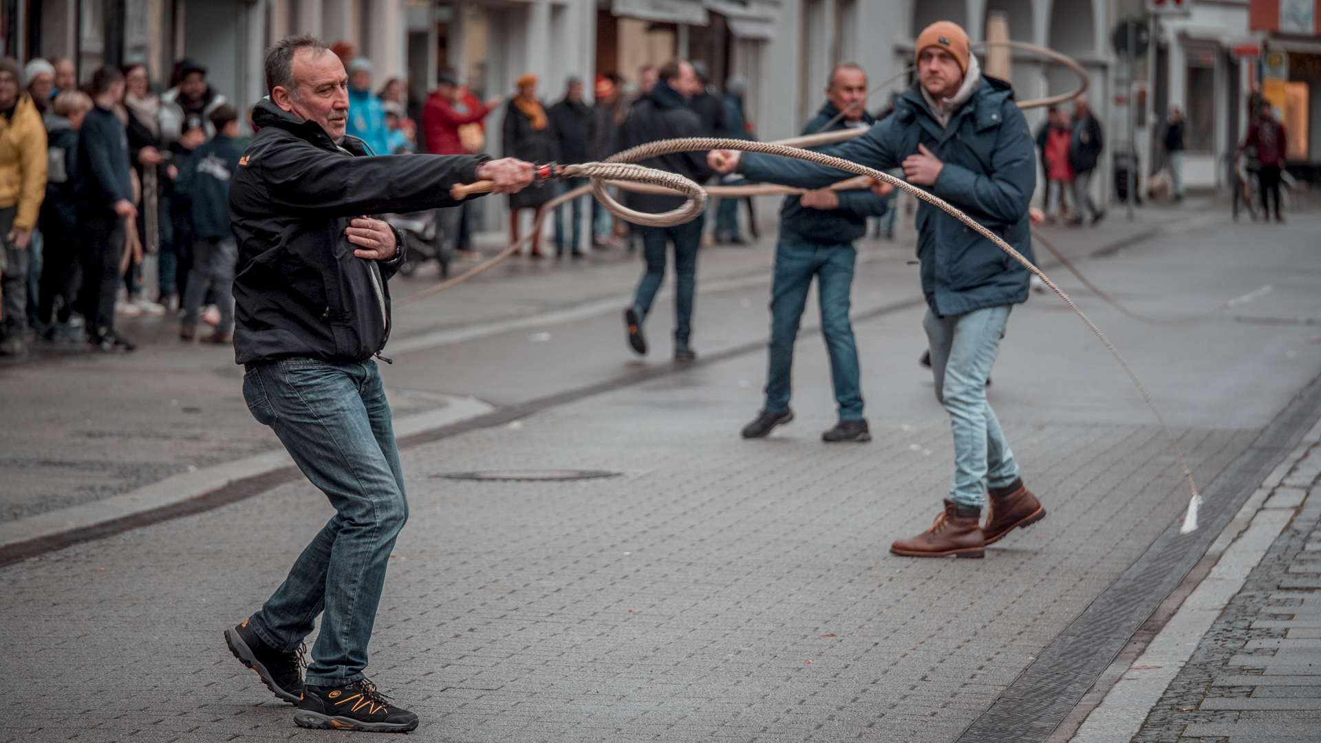 Pünktlich mit dem letzten Glockenschlag am Überlinger Münster um 12 Uhr bricht am Heiligen Dreikönigstag in der Münsterstraße das Chaos aus. Vor hunderten Zuschauer wird in Überlingen die Fasnet mit dem traditionsreichen „Einschnellen“ (SWR) eingeläutet. Dabei schwingen Narren die für die schwäbisch-alemannische Fastnacht charakteristischen Peitschen und Karbatschen hin und her. Das Ganze erinnert mich spontan an Schüsse und macht einen Höllenlärm.