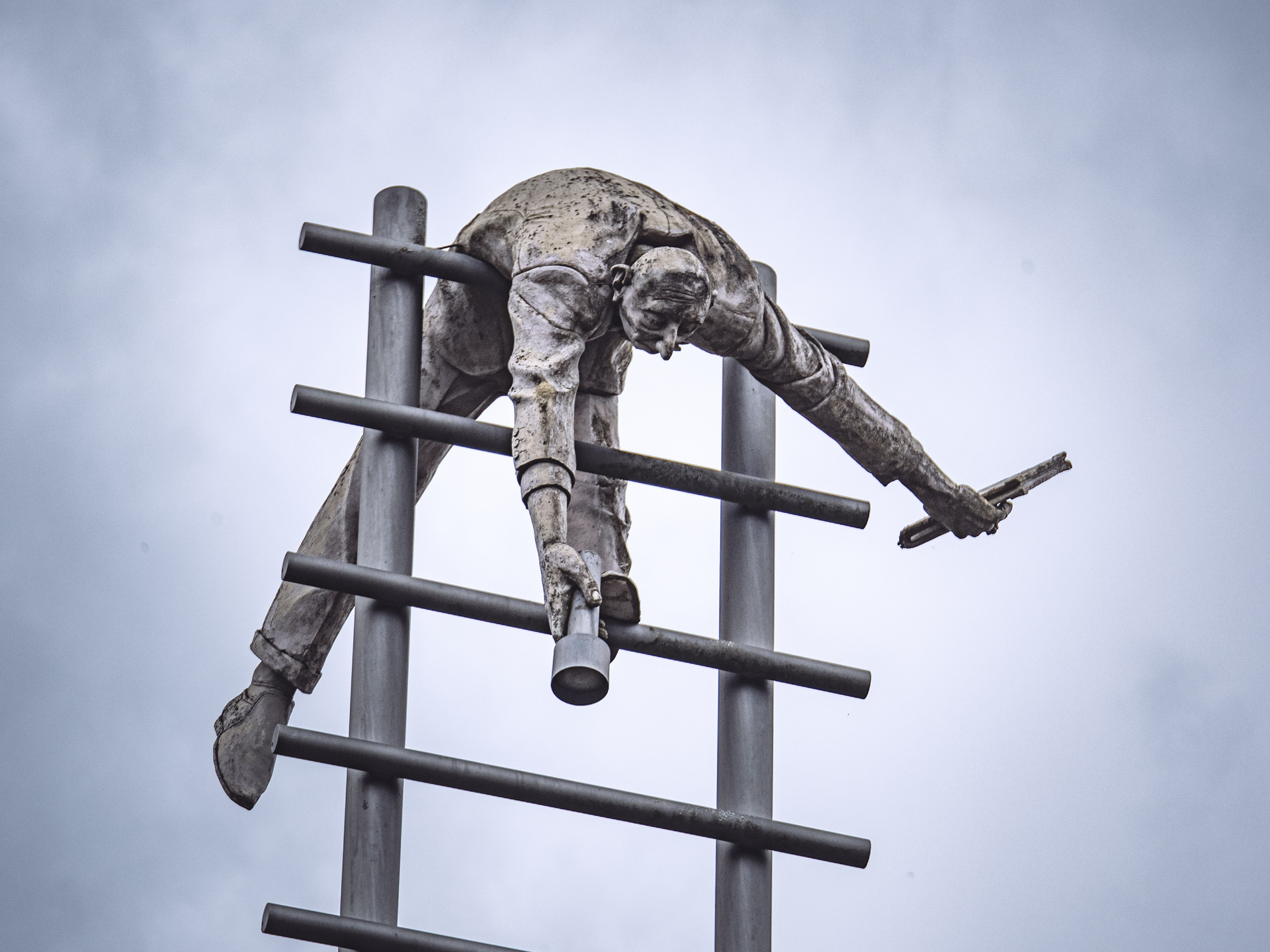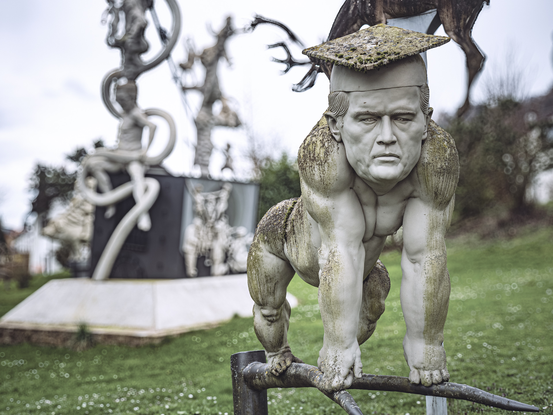 Man kann nicht alles sehen, da entweder ein Zaun, oder eine Mauer die weiteren Einblicke verwehrt, aber auch so, von außen, kann man bereits eine Menge der Skulpturen sehen und auch gut fotografieren. So zum Beispiel die gut 10 Meter hohe Skulptur zu Stuttgart 21 mit der prominenten Figur des Baden-Württembergischen Ministerpräsidenten Kretschmann der mit der ICE Schlange ringt und einer Menge anderer politischen Persönlichkeiten, die mit dem Thema zu tun haben oder hatten. Die Skulptur sollte ja eigentlich in Stuttgart stehen – stand sie wohl auch kurz – aber dort war man „not amused“. Also steht sie jetzt in Bodman im Garten des Künstlers.