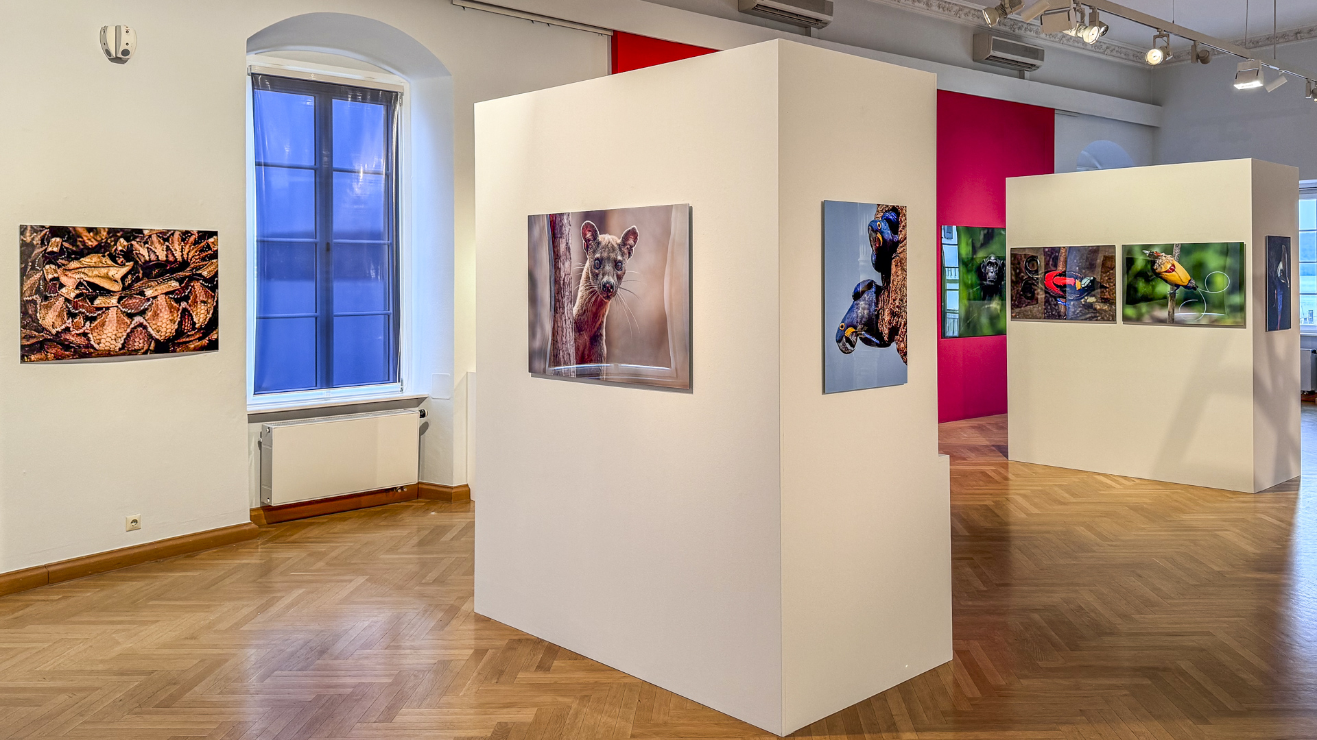 Der vordere Raum der Galerie wird von Fotos dominiert, die der Biologe, Naturfotograf und Direktor des Salemer Affenbergs, Roland Hilgartner in seinen Expeditionen in gut 1900 Tage in afrikanischen Savannen, im Dschungel am Amazonas, oder den Wäldern von Madagaskar fotografiert hat. Faszinierende, großformatige Aufnahmen von einer Tierwelt, die man so noch nicht oft gesehen hat.