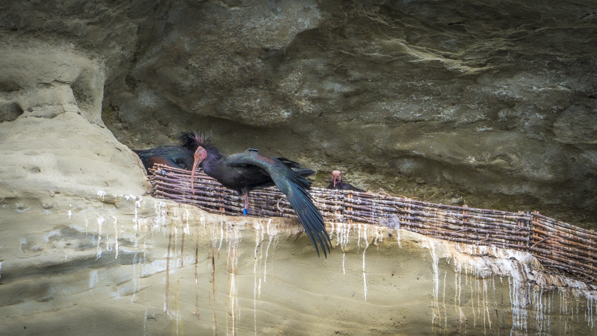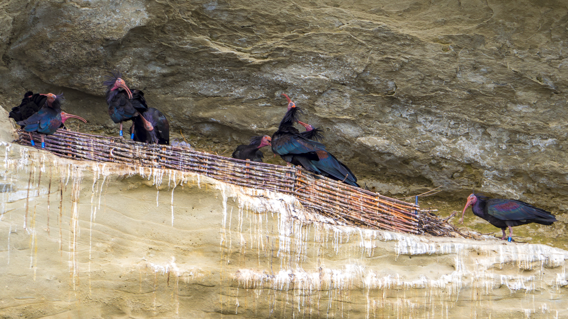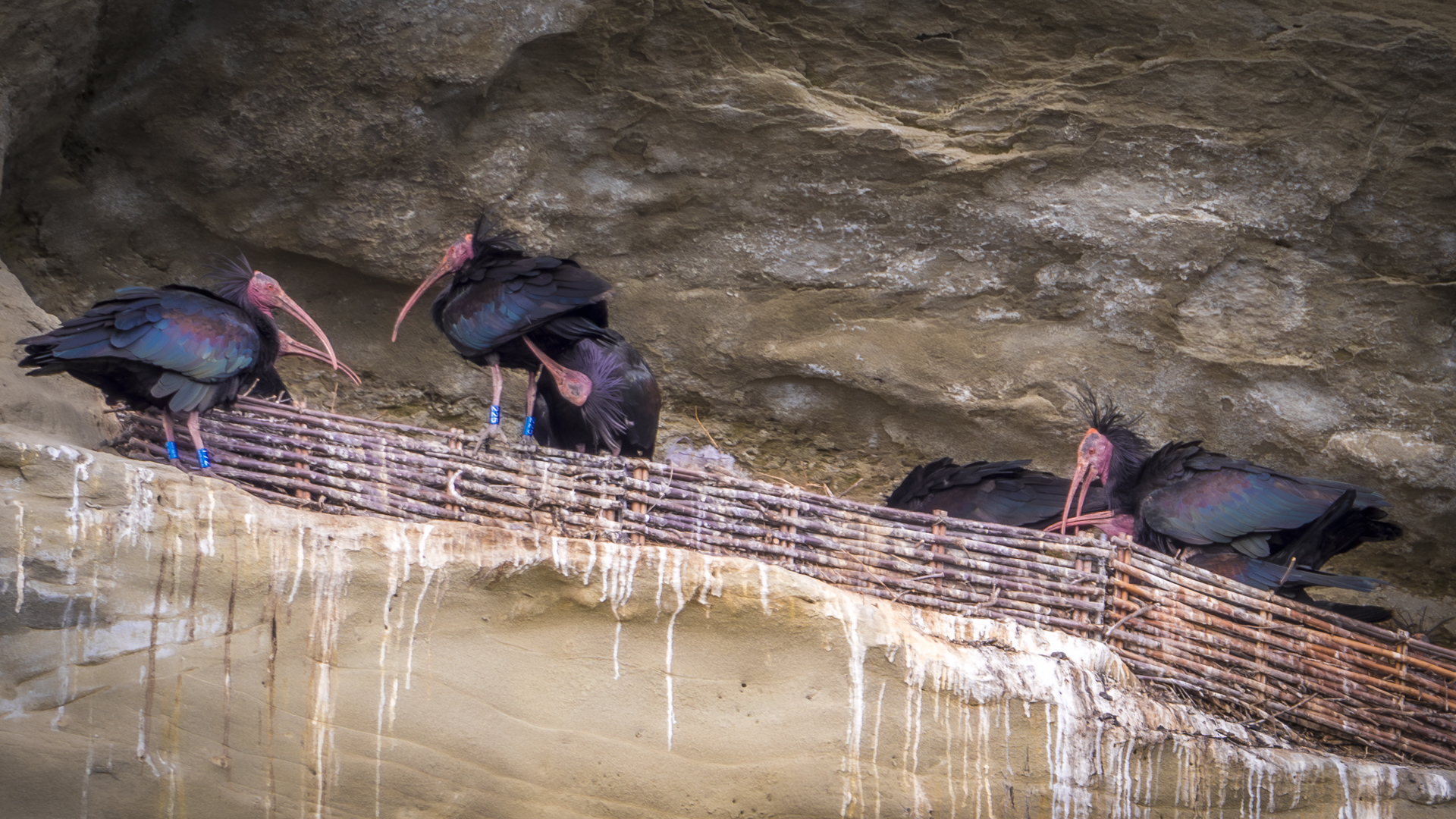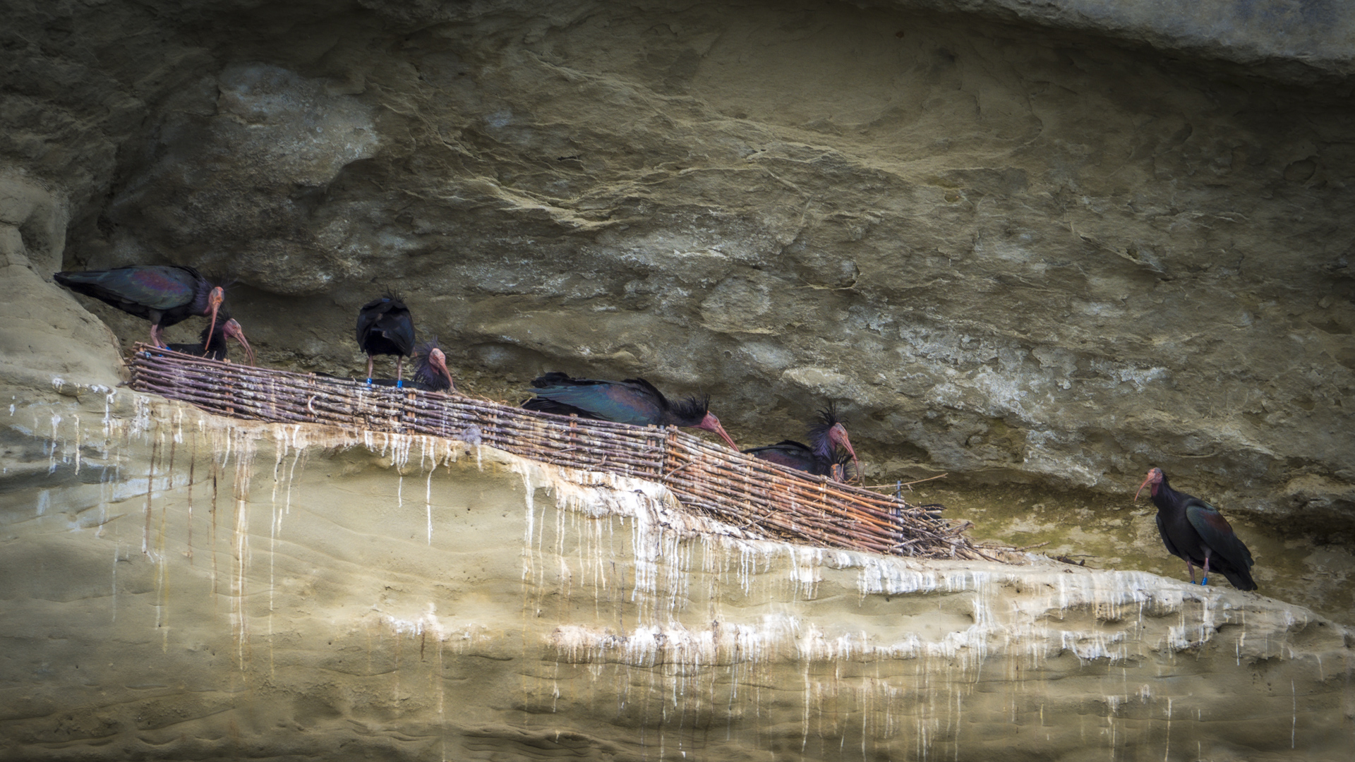 Nach kurzer Zeit sind alle Waldrappe an Bord. Nun stehen Feder- und Nestpflege an und zwei der Waldrappe überkommen wohl die Frühlingsgefühle und es wird kurz aber heftig an der Herstellung von Nachwuchs gearbeitet. Ich bin inzwischen froh, mich in Geduld geübt zu haben. Bei meinem Fotokollegen nebendran ist inzwischen der Akku leer und er macht sich wieder auf den Heimweg. Damit bleibt das kurze Techtelmechtel exklusiv für mich.