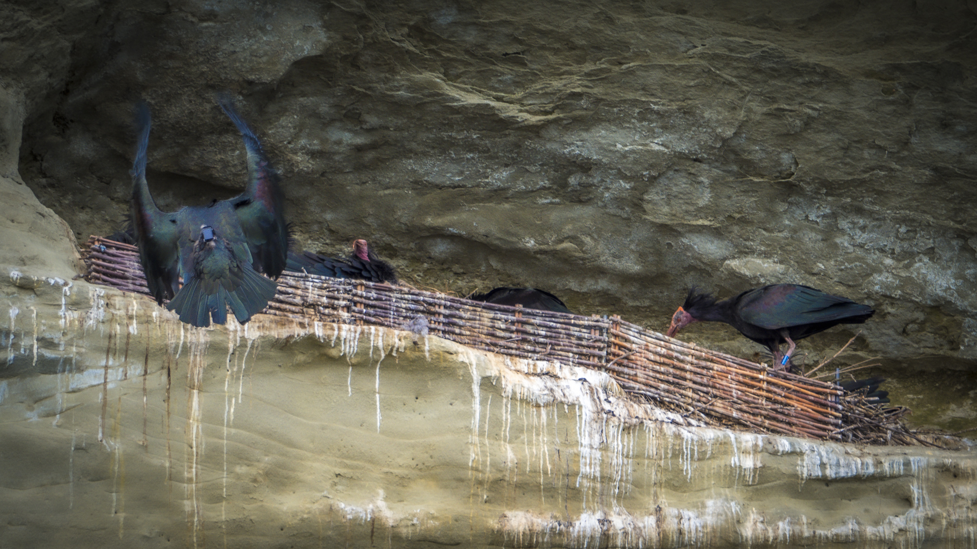 Als ich gegen halb vier unter dem Felsen ankomme, treffe ich zwar noch einen anderen Fotografen, aber von Waldrappen ist nicht viel zu sehen. Ab und an taucht mal ein Kopf auf, aber mehr als zwei Köpfe werden es nicht. Ich will schon wieder alles einpacken, als es über uns rauscht und flattert. Schnell die Kamera wieder hochnehmen, um ein paar Fotos von den anfliegenden Waldrappen auf die Karte zu bekommen.