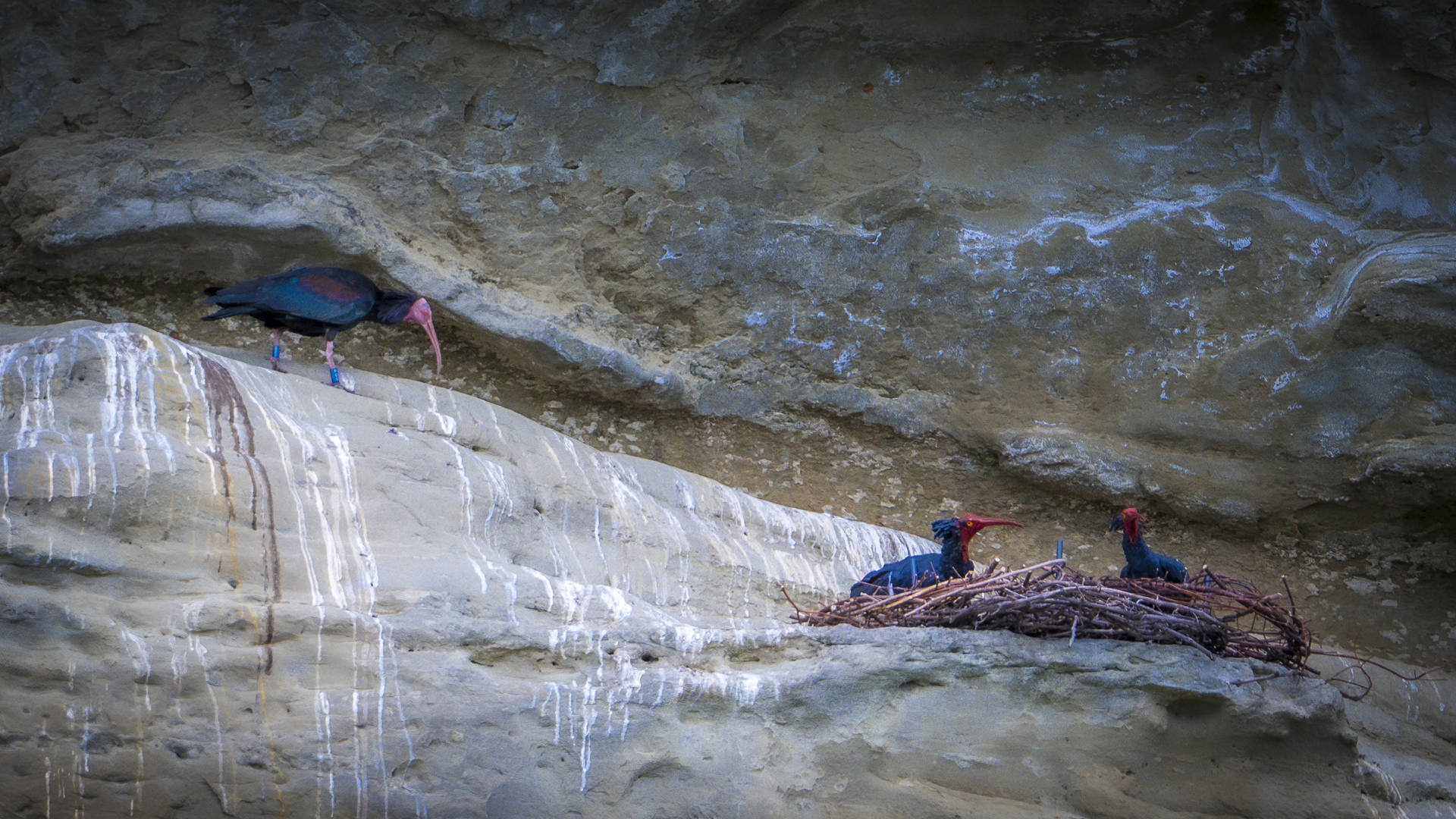 Während sich die meisten Waldrappe mit Nestbau, Brüten und Körperpflege beschäftigen, schlendert einer der Waldrappe rüber zu Nachbars, die ja weiterhin still und in sich gekehrt in ihrem Nest hocken. Vermutlich fruchtet auch diesmal der Versuch einer Konversation wenig. Wie jedesmal. Aber immerhin sagt er/sie vielleicht mal „Hallo“.