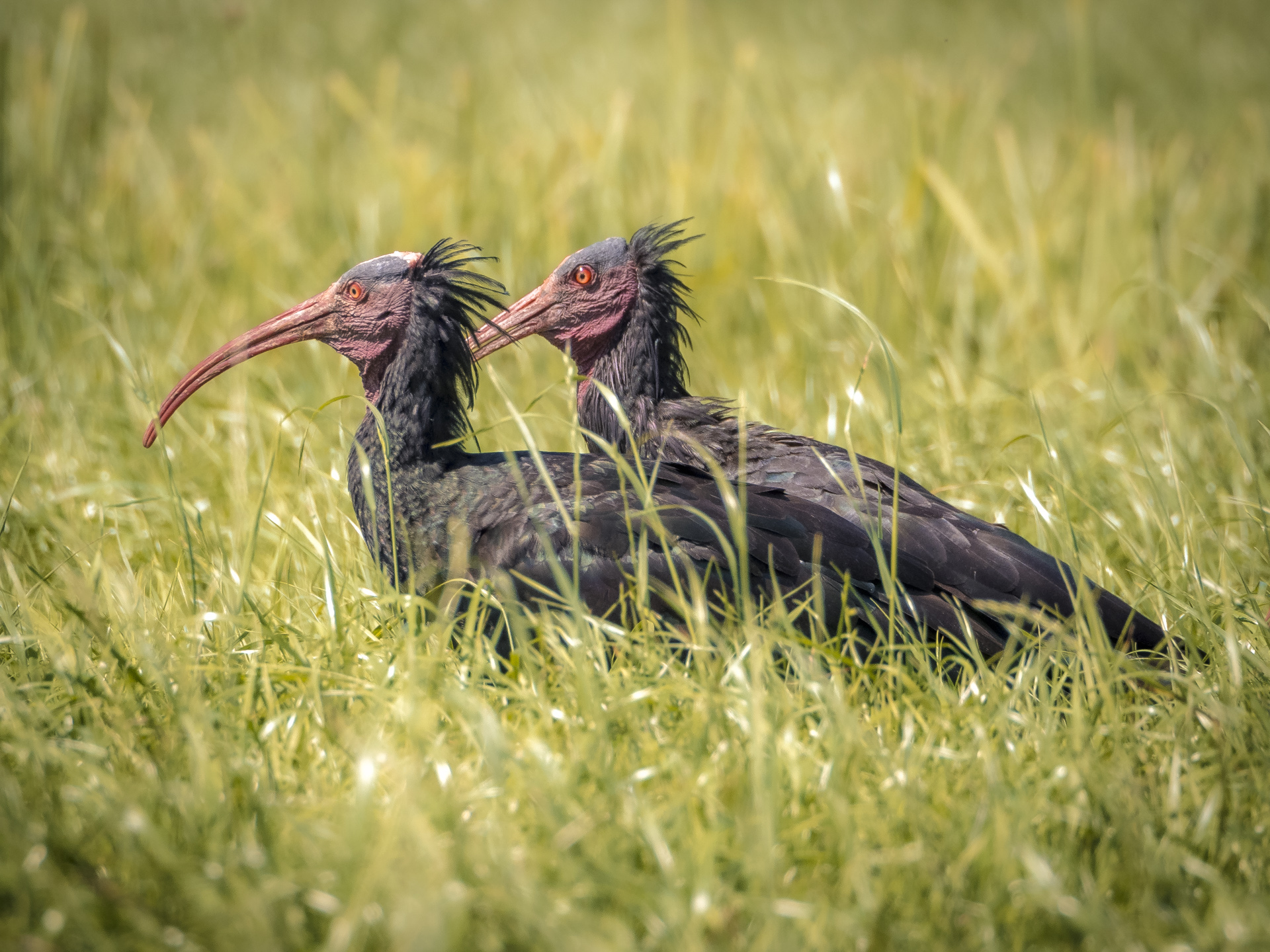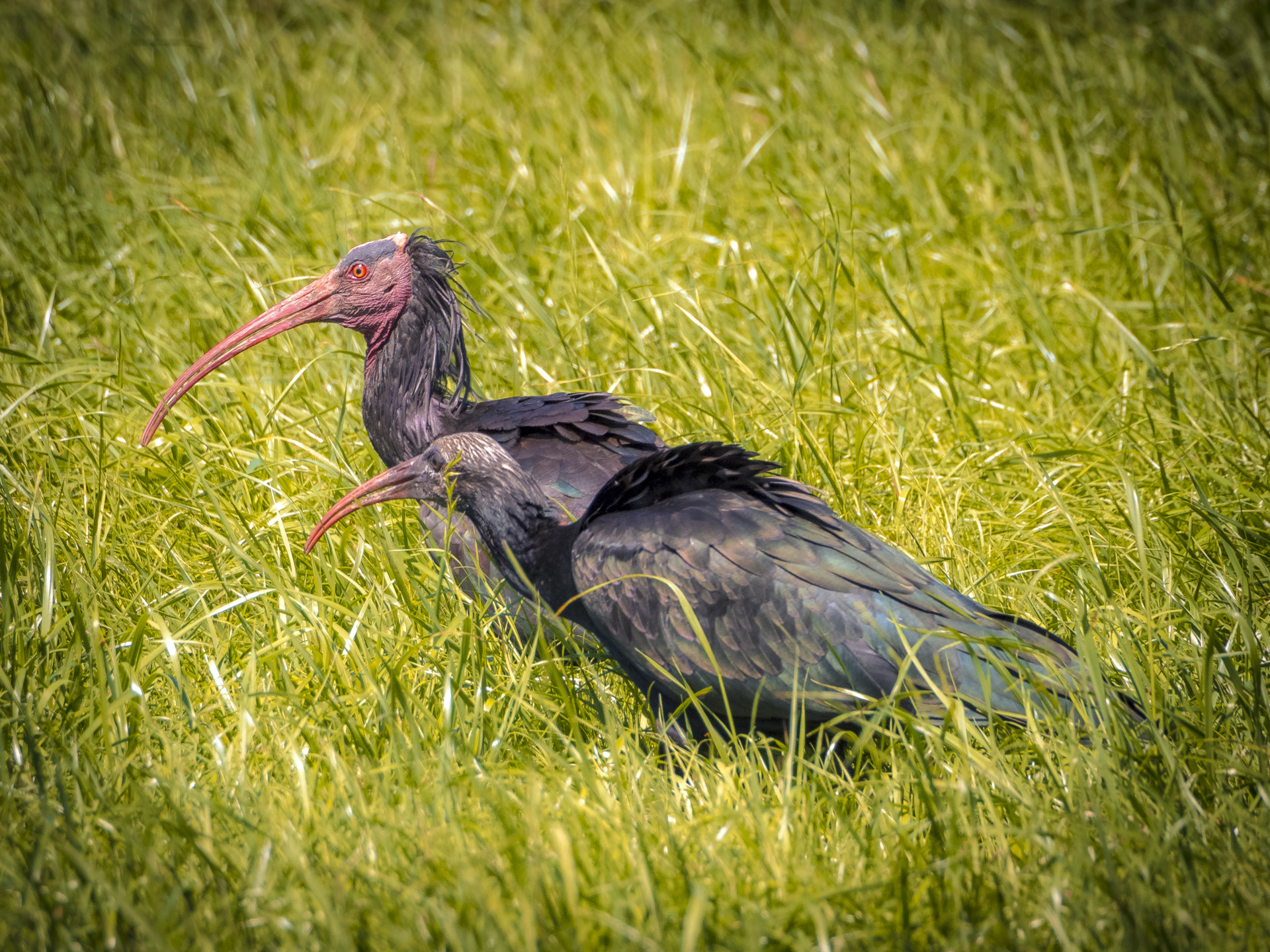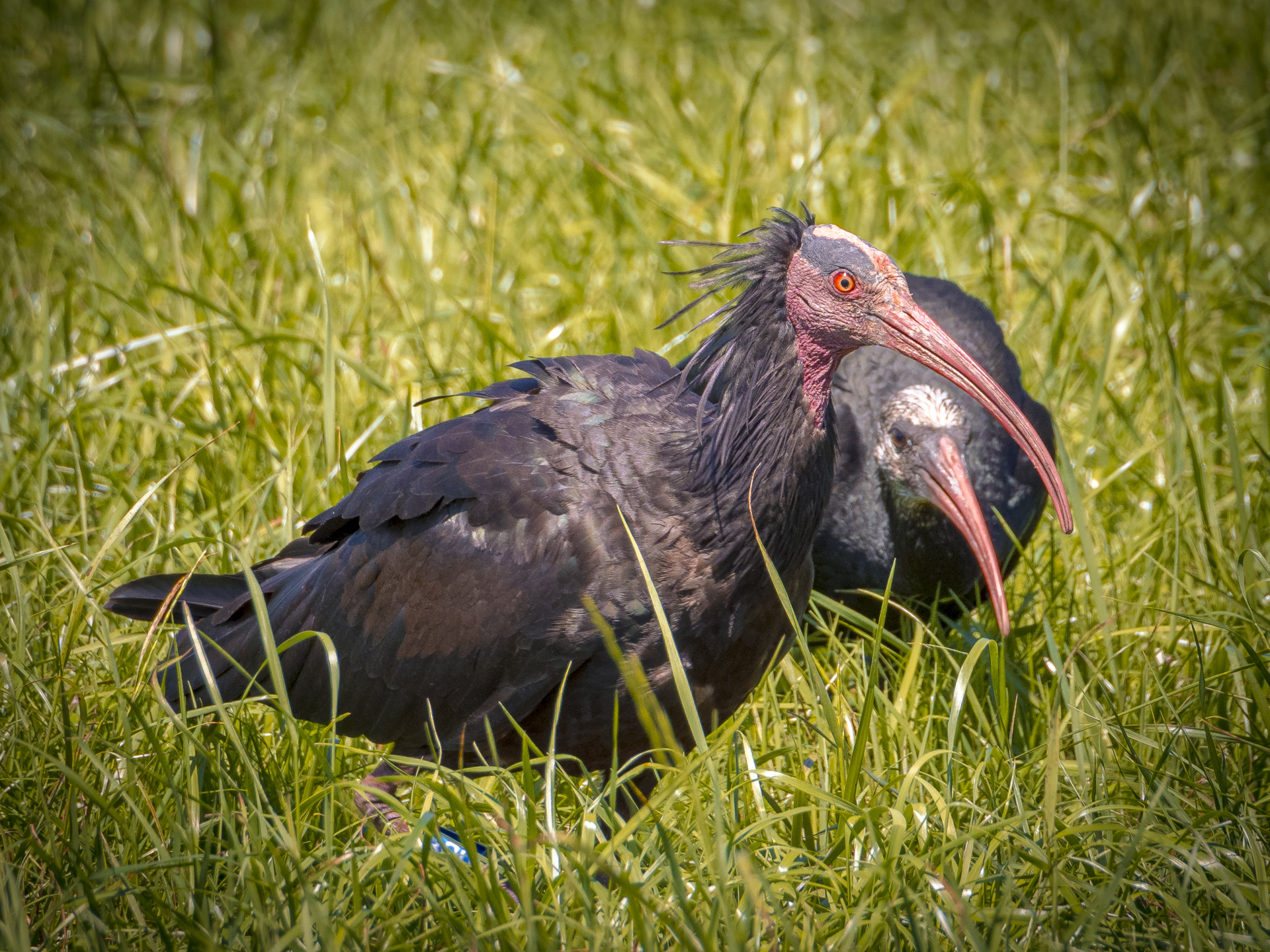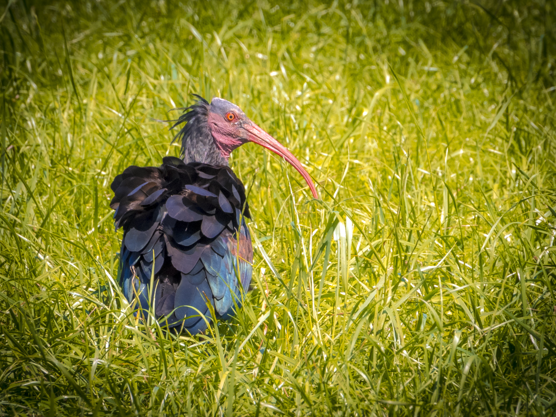 Bevor ich in der Sonne umkippe, trenne ich mich schweren Herzens von der Waldrappkolonie. Herz und Kopf sind voll toller Eindrücke dieses merkwürdigen, aber schönen Vogels. Ich bin sehr dankbar, dass sie mich so nah an sich herangelassen haben, ohne zu flüchten. Vielleicht sind sie aber Menschen noch aus ihrer erfolgten händischen Aufzucht gewohnt. Ich konnte sie nicht fragen. Ein besonders schönes Exemplar habe ich mir bis zum Schluss dieses Beitrags aufgehoben. Schön, oder?