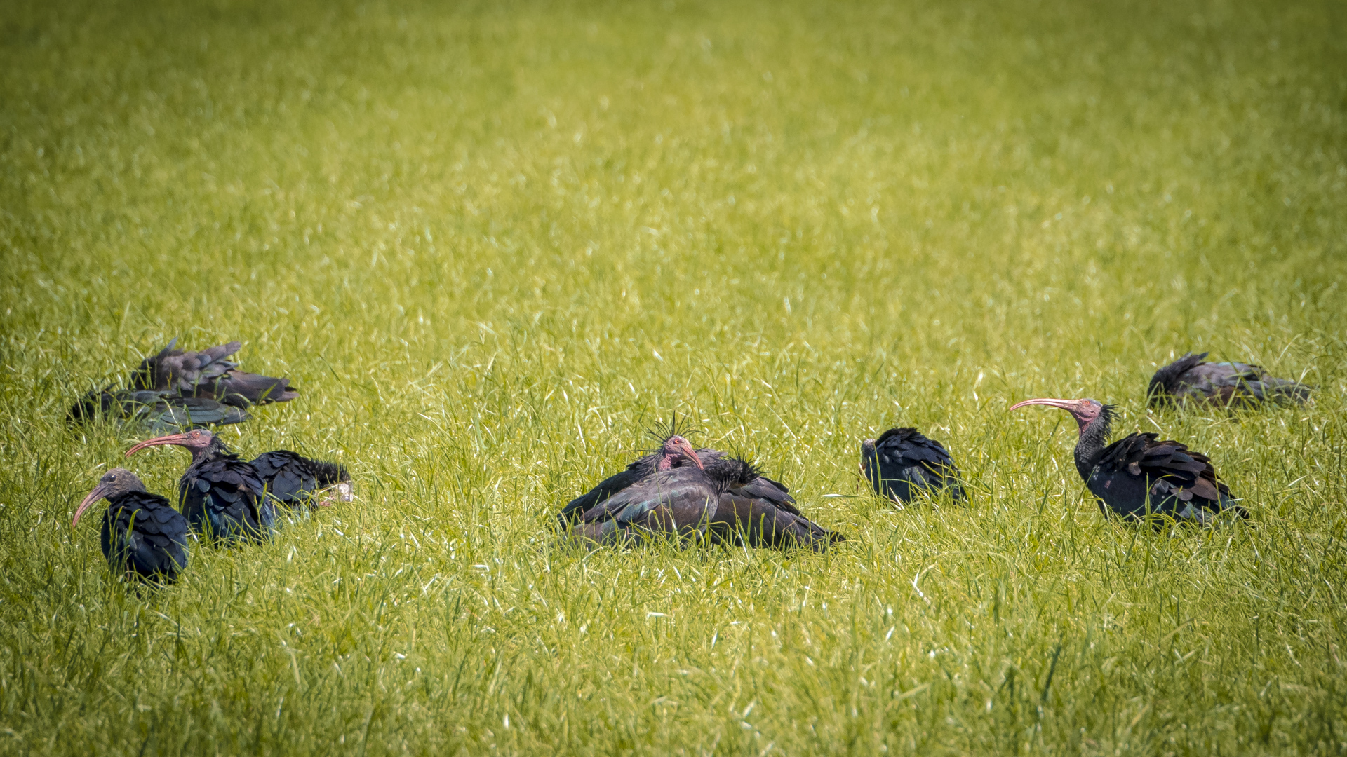 Ich habe mit der Kamera und dem Tele gespannt den Flug und die Landung verfolgt und kann mein Glück gar nicht fassen: Da sind sie ja. Gut versteckt im halbhohen Gras laufen sie umher. Rupert, Zoppo, Marcello, Urmel, Ciop, Bernardo, Vincino, Limoncello, alle da, plus jede Menge Nachwuchs. Aus den ursprünglich acht Vögeln sind inzwischen zwanzig geworden. Die Jungvögel haben noch blaue statt rote Augen und gehen ihren Eltern auf die Nerven.