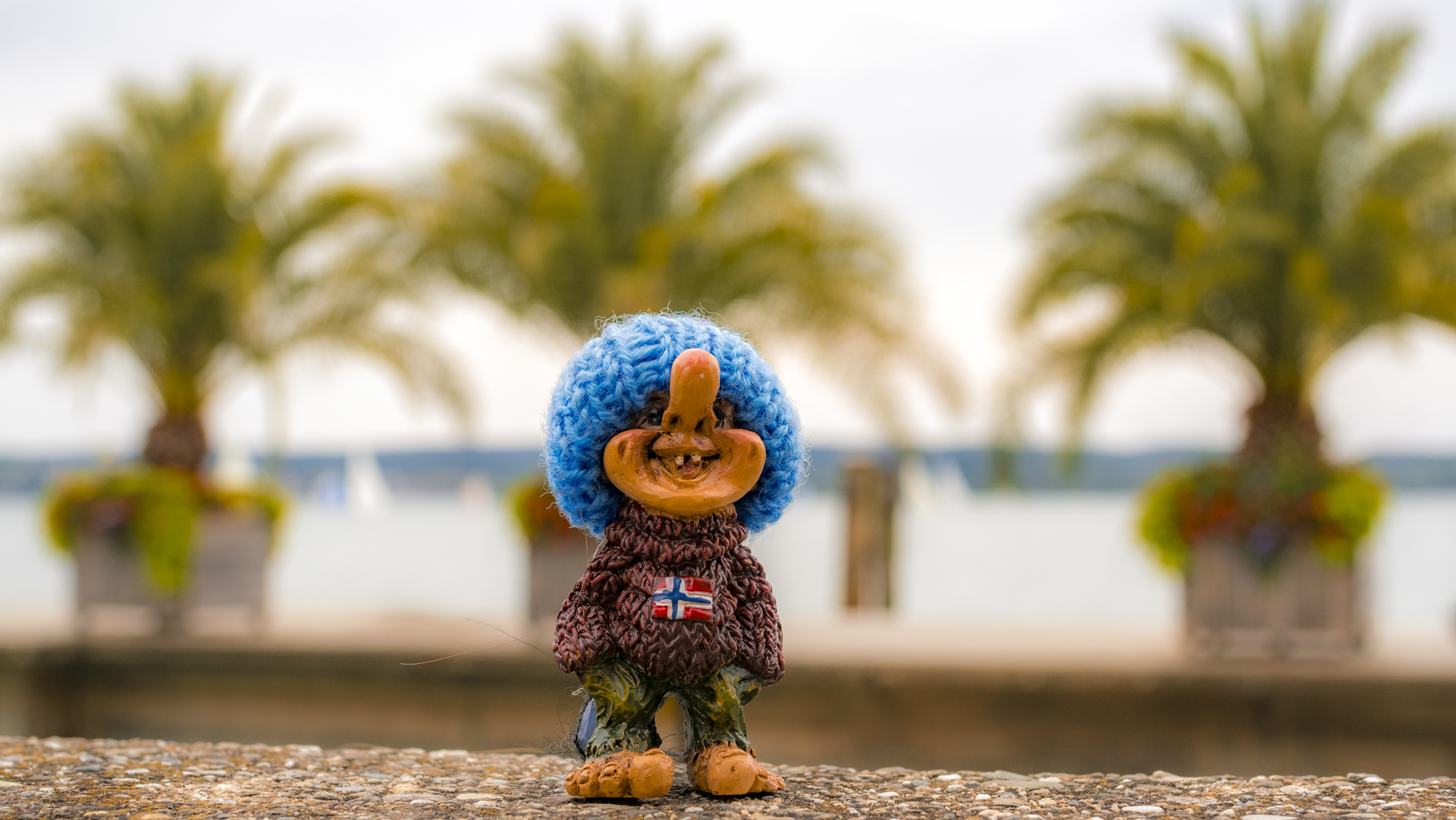 Was Trolli natürlich gefreut hat, ist, dass es auch am Ufer des Bodensees Menschen gibt, die sehr geduldig und kreativ sind, um kleine Steintürmchen zu bauen. Da kam er sich grad vor, wie auf unserer Reise zum Nordkapp vor gar nicht so langer Zeit. Ich war nicht ganz so geduldig, daher nur ein kleines Türmchen. Für das Titelbild habe ich mir ein bestehendes Türmchen ausgesucht, mit dem hochkant aufgestellten Stein ein schönes Exemplar. Wie gemacht für Trolli als Kulisse. Und was gibt es in Überlingen, aber eher selten in Norwegen? Richtig, Palmen.