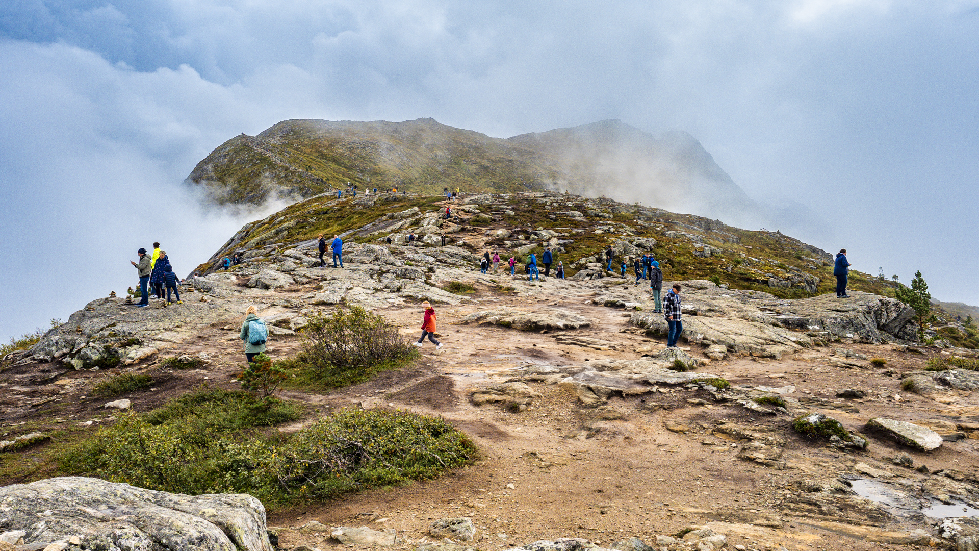 Auch wenn immer wieder große Wolkenfetzen über das Plateau zogen, hatten wir doch Glück, dass zwischendurch freie Sicht auf das Umland und hinunter auf das kleine Städtchen Andalsnes möglich war. Ansonsten hätten wir dort oben blind in den Wolken gestanden. Das Titelbild ist aus einer Serie von Bildern die ich schon eine geraume Zeit mache, ich, von hinten, mit Blick in die Ferne, hier auf den Romsdalsfjorden. Dabei hilft mir natürlich immer gern meine Frau und fotografiert mich so oft, bis die Pose stimmt.