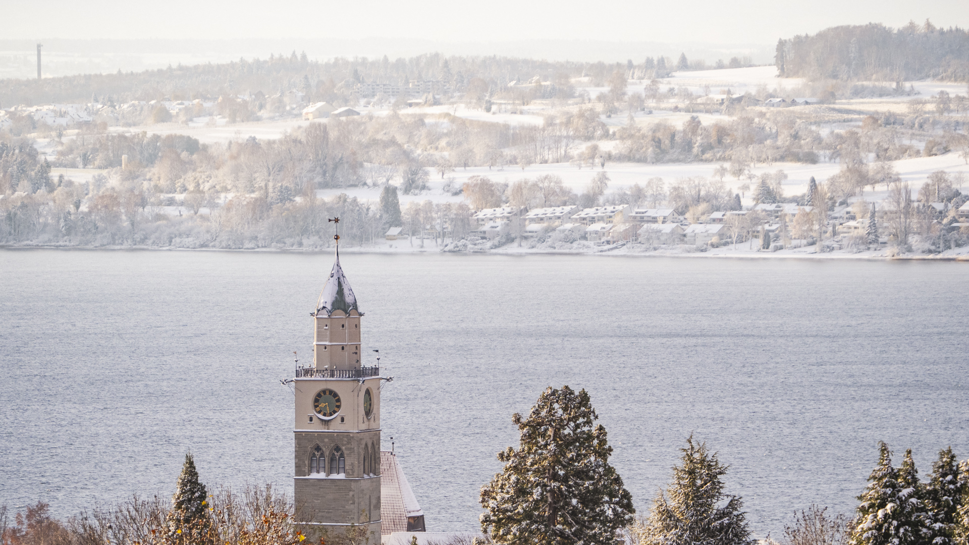 Der erste Weg – der ja auch der kürzeste ist – führt durch die Tiefgarage direkt auf die Aussichtsplattform des Q5, unseres Wohnviertels am oberen Ende von Überlingen. Von hier hat man einen fantastischen Blick in die Gegend. Mit dem Tele über das Überlinger Münster visiert und den verschneiten Bodanrück als Hintergrund eingefangen.
