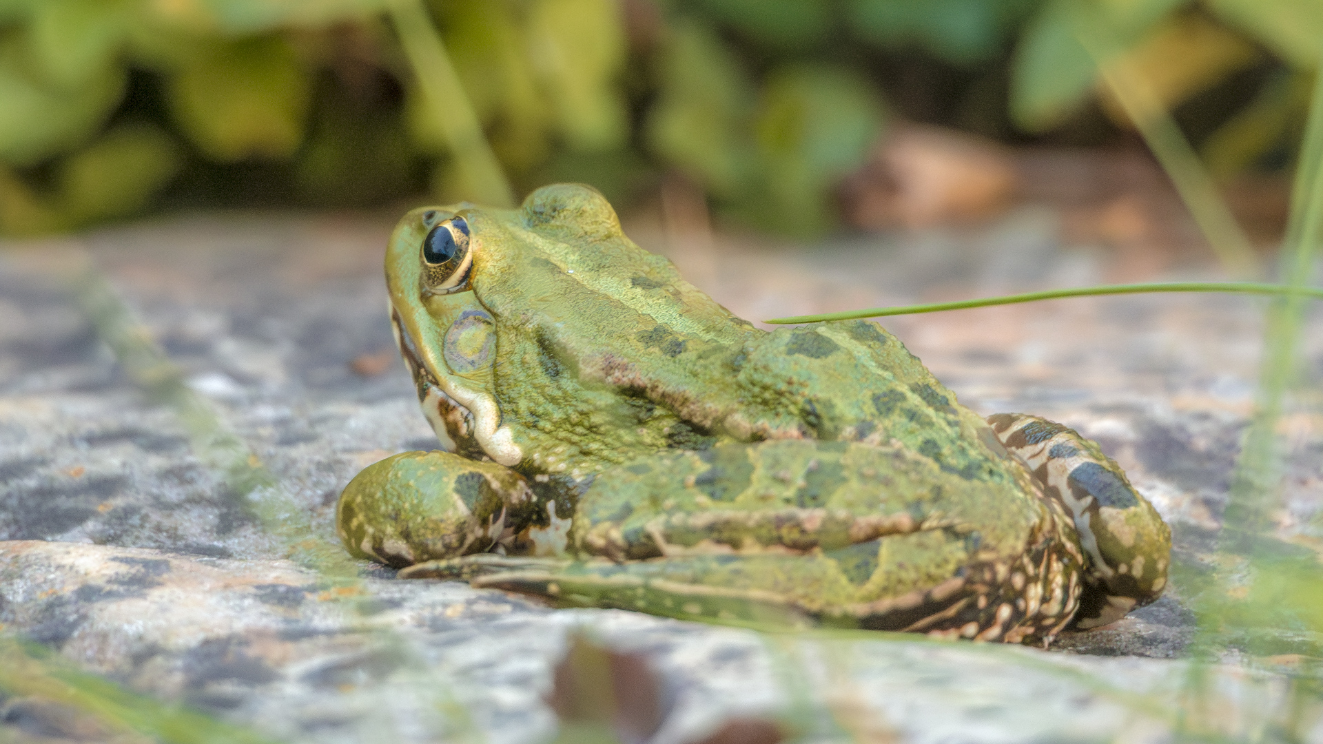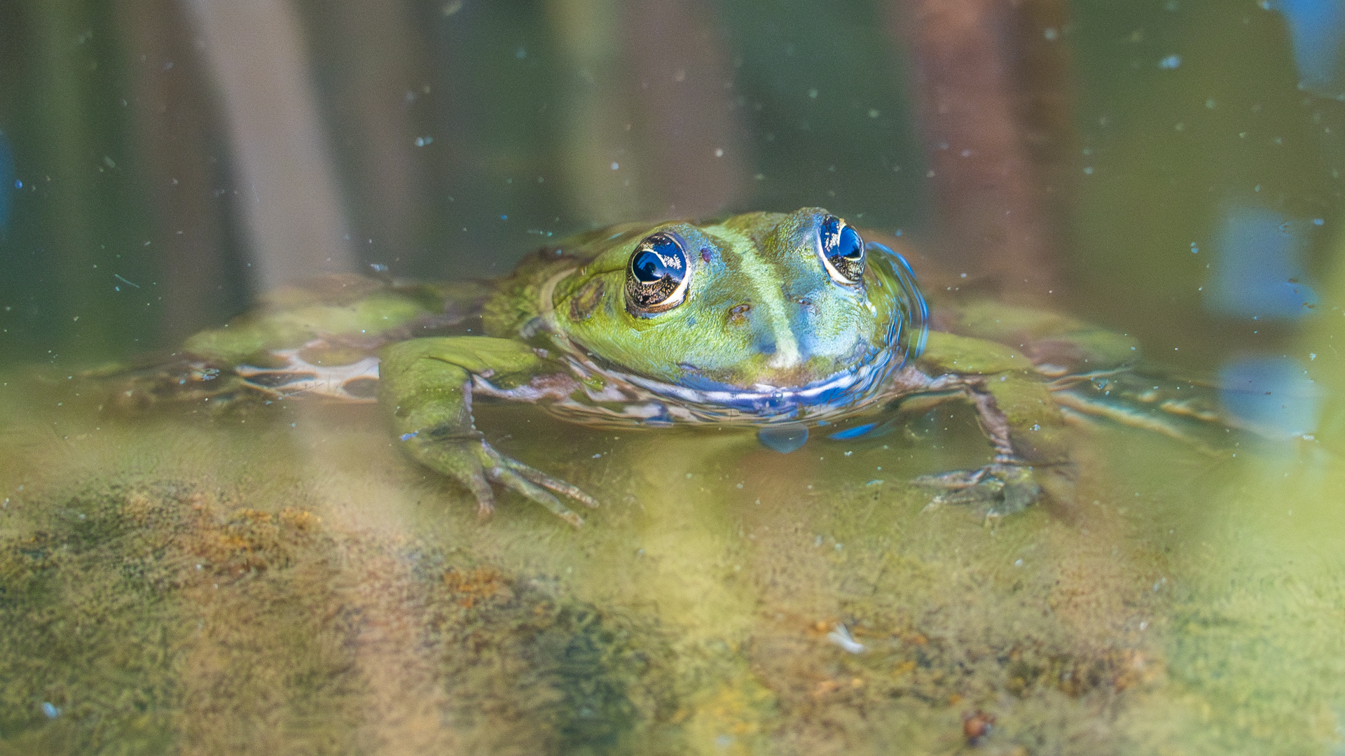Also bin ich zurück zum Wohnmobil, um meine Olympus mit dem Telezoom zu holen, in der Hoffnung, aus etwas mehr Abstand die Frösche nicht zu verschrecken. Das hat dann auch ganz prima geklappt. Mit 600 mm (VF-equivalent) und ISO 6400 konnte ich in der Abenddämmerung noch eine 320stel Sekunde erreichen, was für ein paar Froschportraits gereicht hat. Und ich freue mich, diese Frösche auch endlich mal präsentieren zu können.
