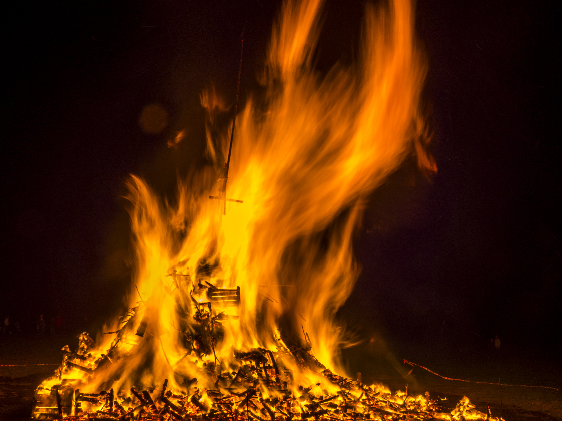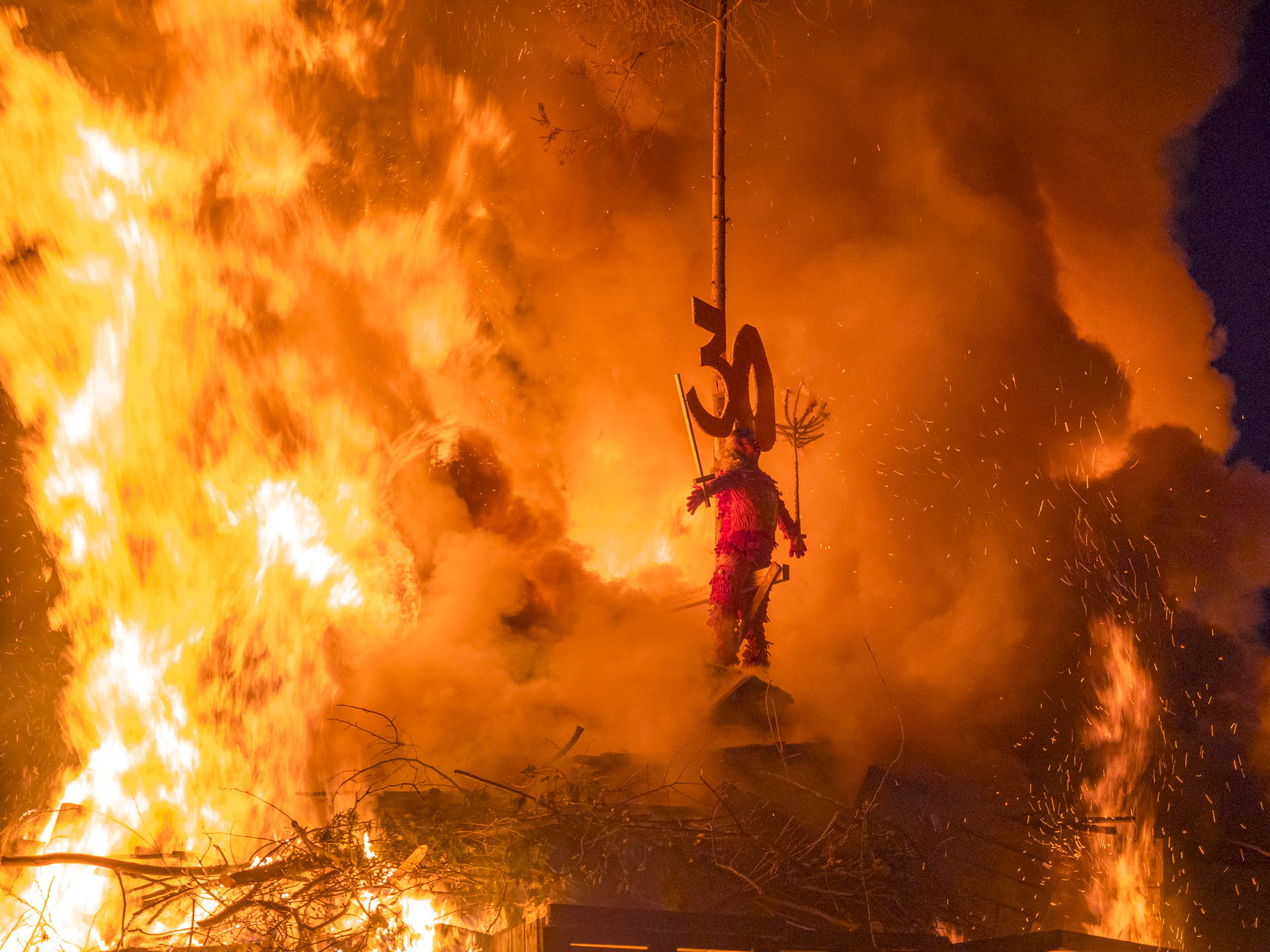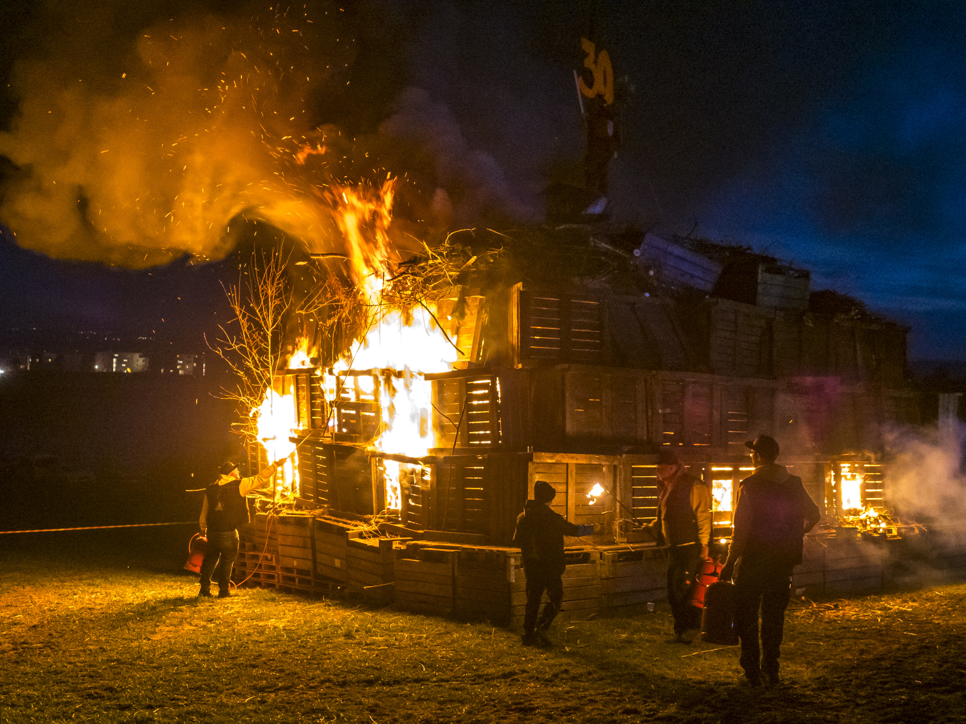 Mal sind es nur aufgestapelte Büsche und Baumreste, manchmal – wie in dem Fall des Funken bei Aufkirch, über den Dächern von Überlingen – ein riesiges Konstrukt aus Brettern, gefüllt mit Holz und Stroh. Die Größe ist diesmal dem Jubiläum der Überlinger Löwinnen geschuldet, die ihr 30-Jähriges Bestehen feiern.