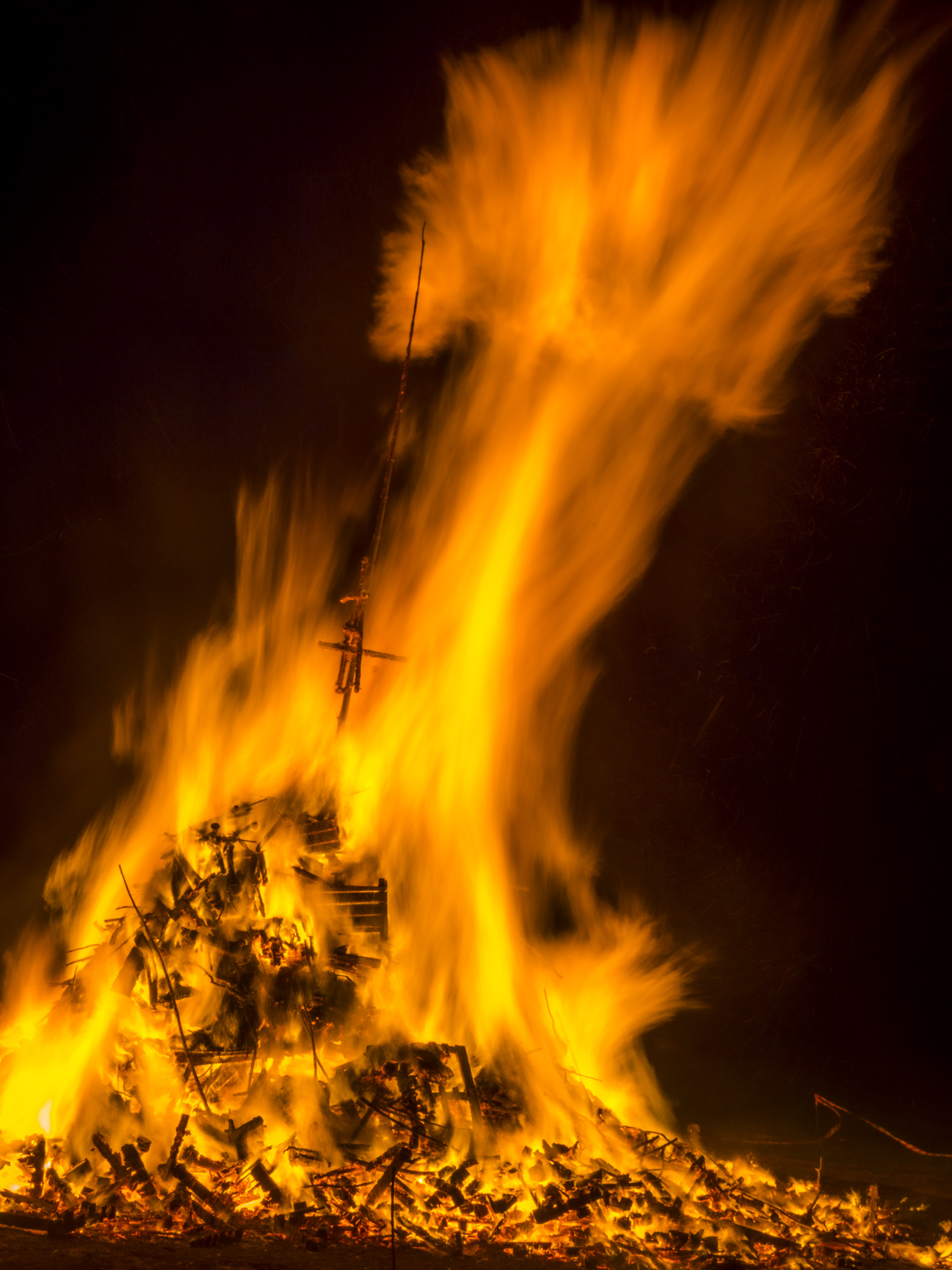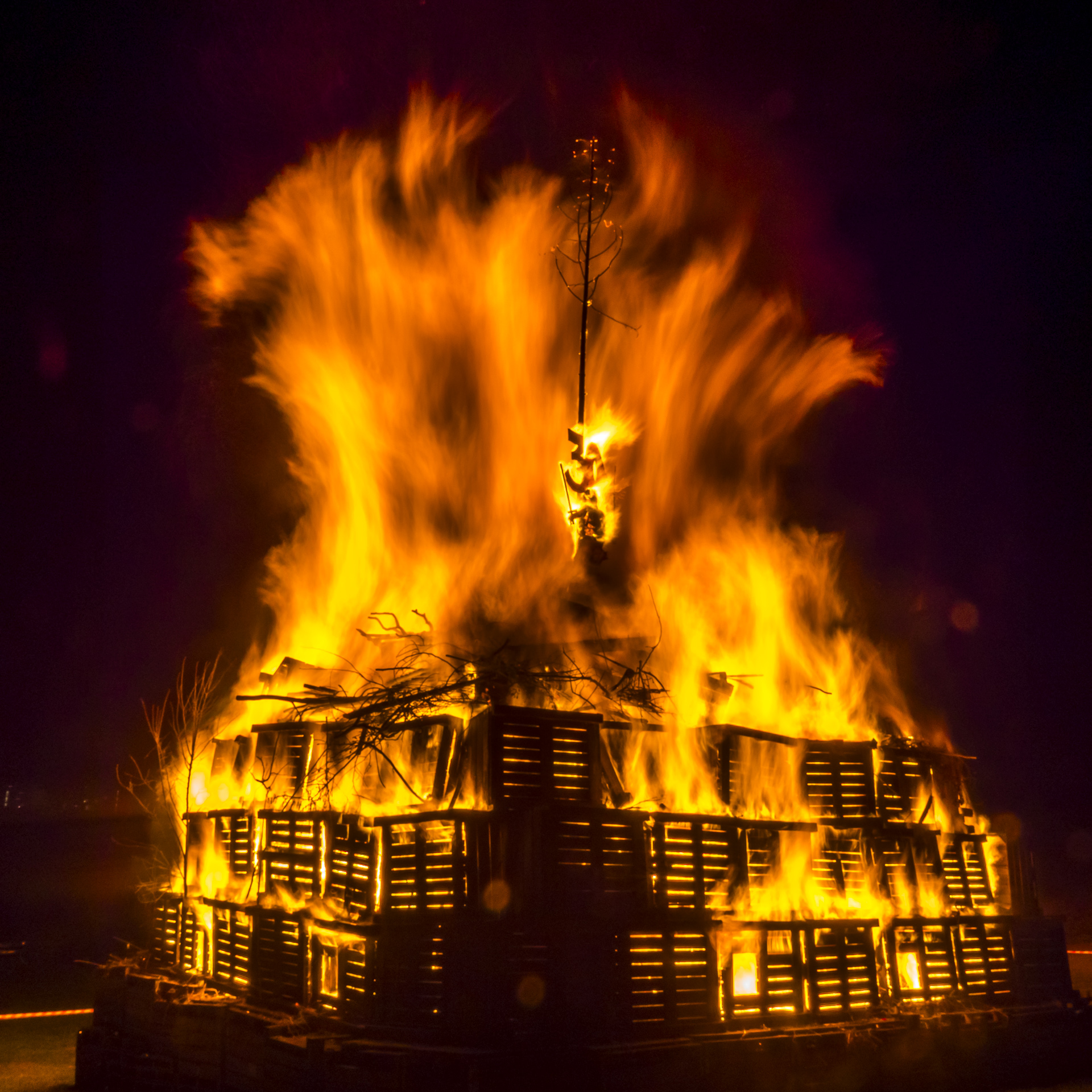 Langsam frisst sich das Feuer durch das Holz im Inneren des Stapels, erreicht aber schnell auch das Äußere. Spätestens jetzt beginnt der Rückzug der Zuschauer, die bis dahin am Rande der Absperrung das Spektakel bestaunen. Es wird heiß. Sehr heiß. Wie sich das für die arme Löwin anfühlen muss, will ich gar nicht wissen. Der Tod auf dem Scheiterhaufen ist und war sicher keine schöne Art zu sterben.