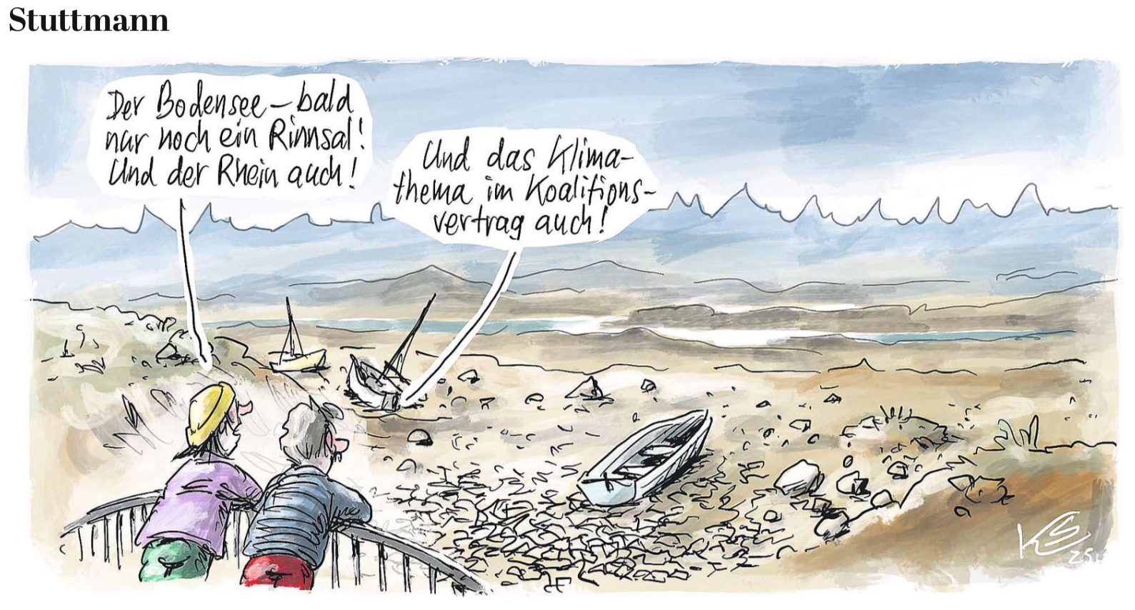 Es lohnt sich also immer noch den Bodensee zu besuchen. Vor allen Dingen Überlingen ist eine lebenswerte und quirlige Stadt und so schlimm, wie es Klaus Stuttmann in seiner Karikatur des heutigen Tagesspiegel darstellt, ist es beim besten Willen noch nicht. Wobei das Thema „Klimawandel“ in der Tat nicht aus den Augen verloren werden sollte. Wir gehen gleich mal runter an den See und schauen nach, ob er noch da ist.