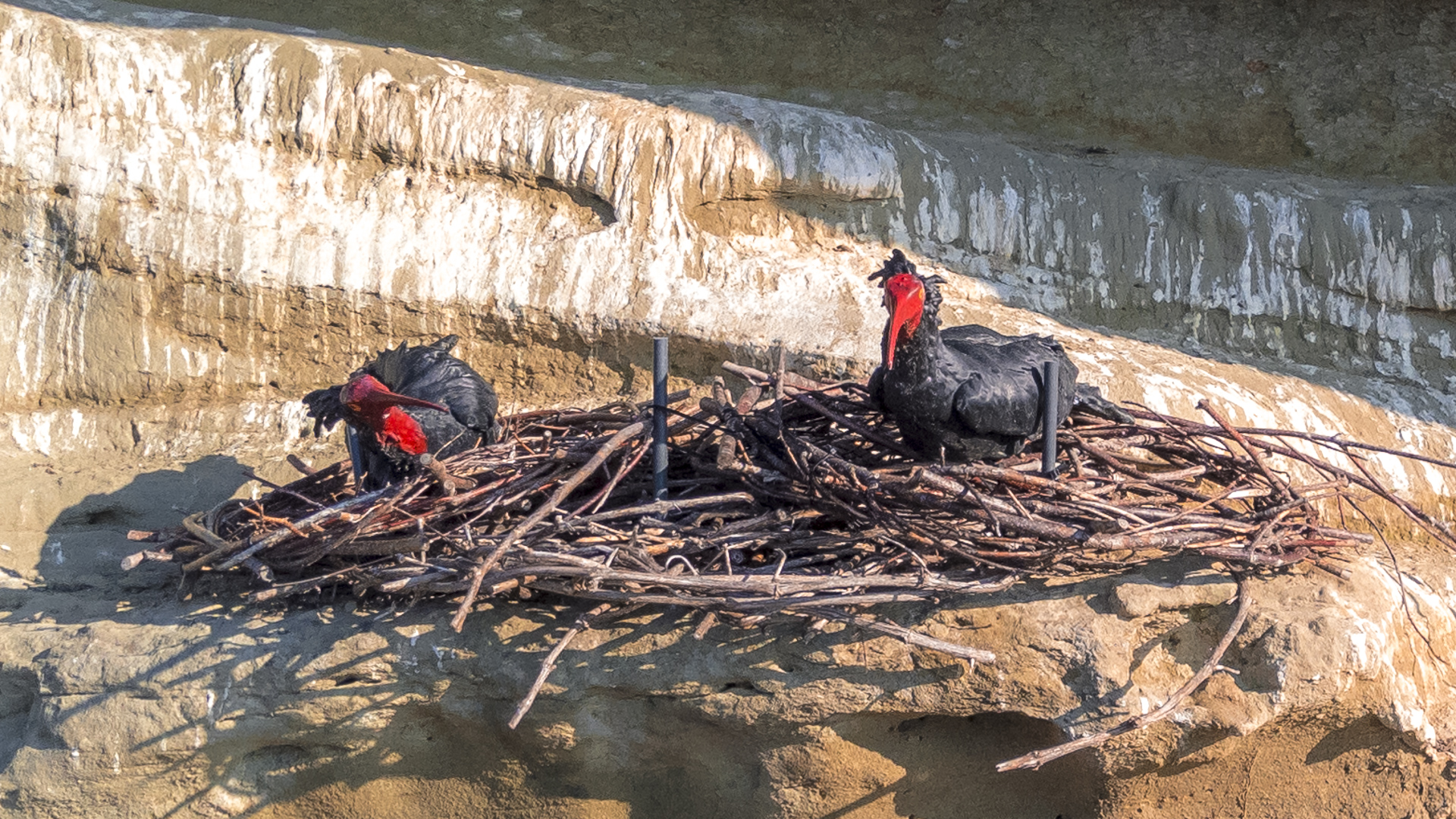 Aktuell sind die einzelnen Waldrapp damit beschäftigt das beste Nest für sich zu erobern. Bevorzugt wird die zweite Reihe und am Liebsten gleich noch mit der richtigen Partnerin. Es gibt allerdings einen Überschuss der männlichen Vögel, könnte also anstrengend werden 😉